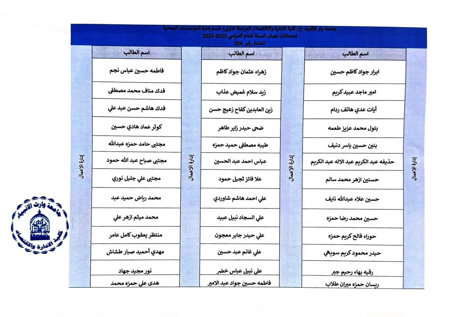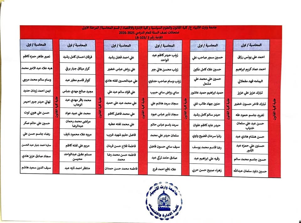 يرجى من الطلبة الاعزاء الحضور قبل وقت الامتحان بنصف ساعة