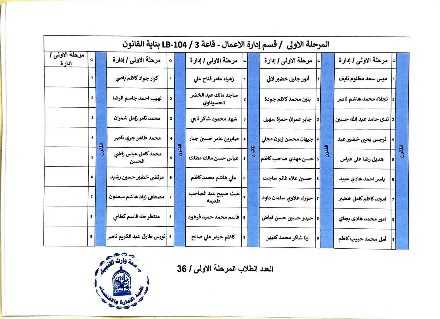 خرائط الجلوس الخاصة بالقاعات الامتحانية للمرحلة الاولى ولكافة اقسام الكلية