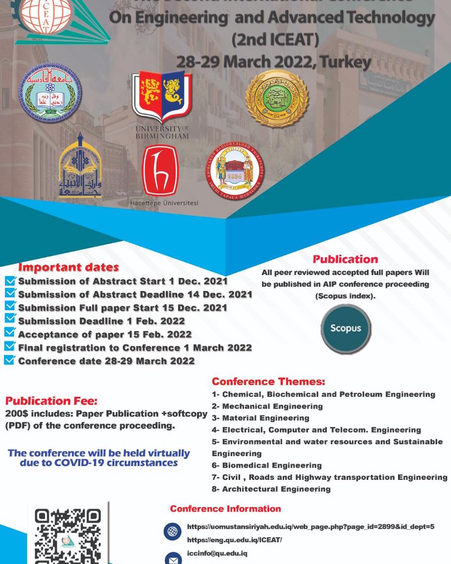،انضمت جامعة وارث الانبياء(عليه السلام) الى الهيئة التنظيمية للمؤتمر الدولي الثاني للهندسة والتقنيات المتقدمة(ICEAT-2022) ،الذي ستقيمه كلية الهندسة بجامعة القادسية ،وبمشاركة كلية الهندسة بالجامعة المسنتصرية ،إضافة الى جامعات دولية اخرى (جامعة حجة تبه التركية و جامعة برمنكهام البريطانية وجامعة كييف الوطنية)