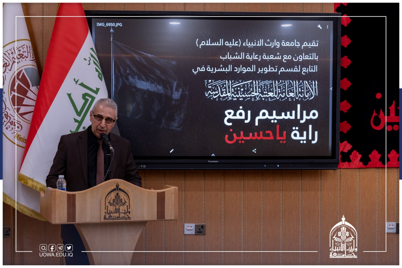 لاحياء هذه المناسبة الأليمة، استشهاد سبط رسول الله (صلى الله عليه واله) وال بيته واصحابه وبهذه المناسبة القى السيد رئيس الجامعة الاستاذ الدكتور ابراهيم الحياوي كلمة اكد من خلالها أن هذا التجمع ليس لمجرد رفع الراية فحسب بل للاعلان عن أننا نجدد الولاية وماضون على طريقكم ونهجكم في التضحية والفداء والبناء، وهذه المناسبة والمراسم هي اشعار بأن هذه الشعائر مقدسة ولابد من اقامتها خاصة من قبل الصروح العلمية وخصوصاً في جامعتنا التي تنتمي الى الإمام الحسين(عليه السلام).