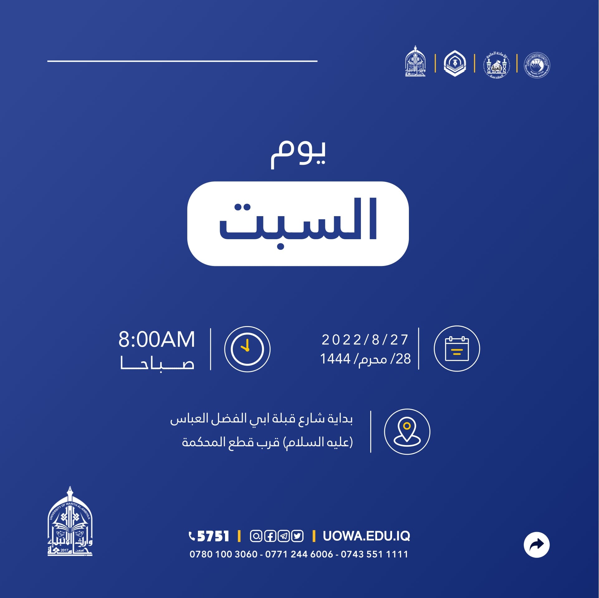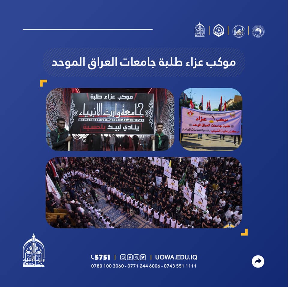 طلبتها الاعزاء في كليات واقسام الجامعة كافة، للمشاركة في (موكب عزاء طلبة جامعات العراق الموحد) الذي يقيمه مركز رعاية الشباب التابع لقسم تطوير الموارد البشرية في العتبة الحسينية المقدسة يوم السبت (2022/8/27) الساعة(8:00)صباحا.