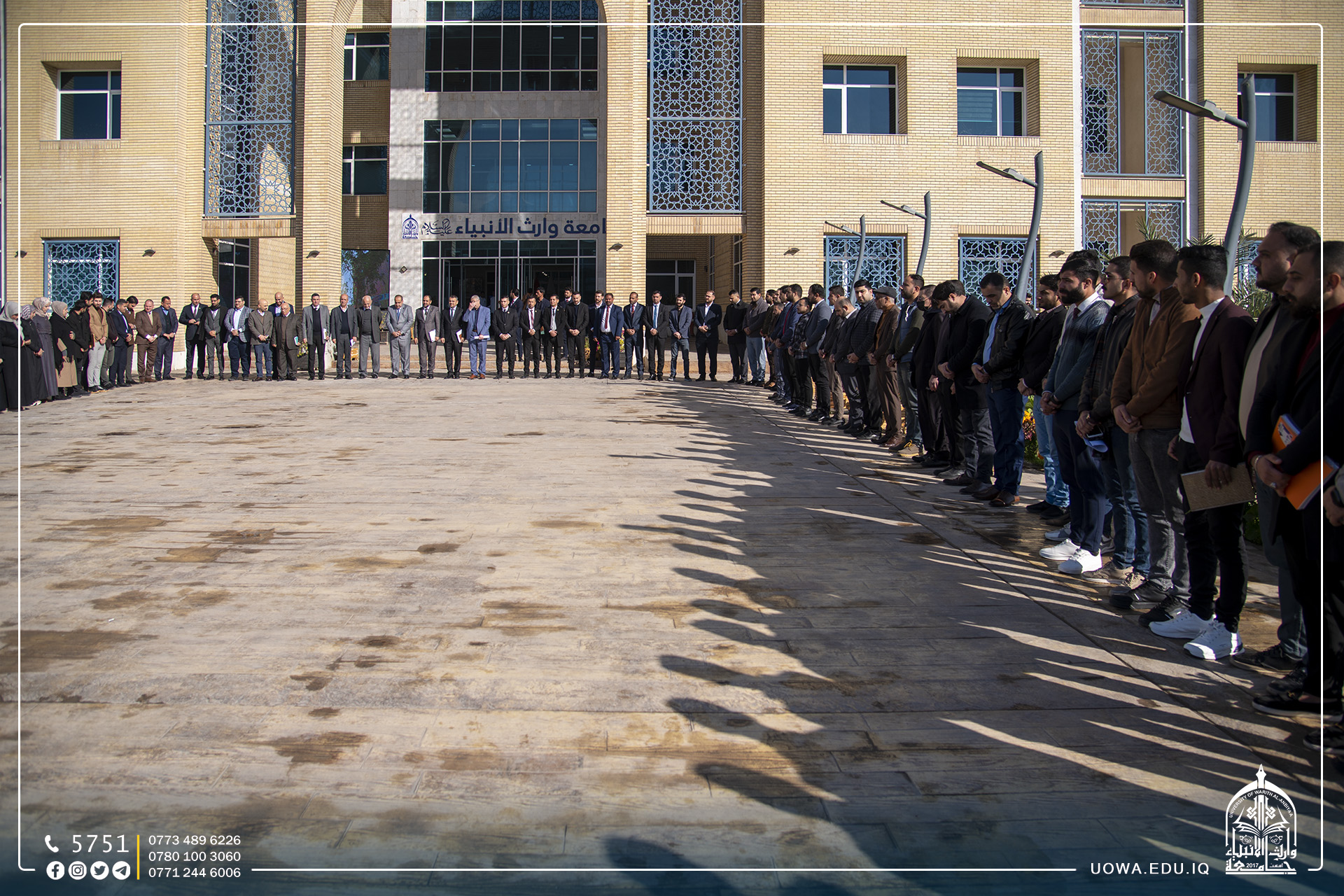 رئاسة جامعة وارث الانبياء(عليه السلام) تنظم وقفة حداد لقراءة سورة الفاتحة بمناسبة الذكرى السنوية الثالثة لاستشهاد قادة معارك النصر على التنظيمات الارهابية.
