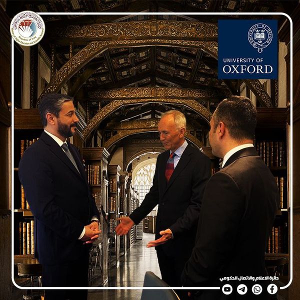 زار وزير التعليم العالي والبحث العلمي الدكتور نعيم العبودي جامعة أكسفورد واطلع على بيئتها التعليمية وأروقتها ومكتبتها والتقى مع عدد من ممثلي الجامعة ومنهم رئيس كلية ولفسون السير تيم هيتشنز.