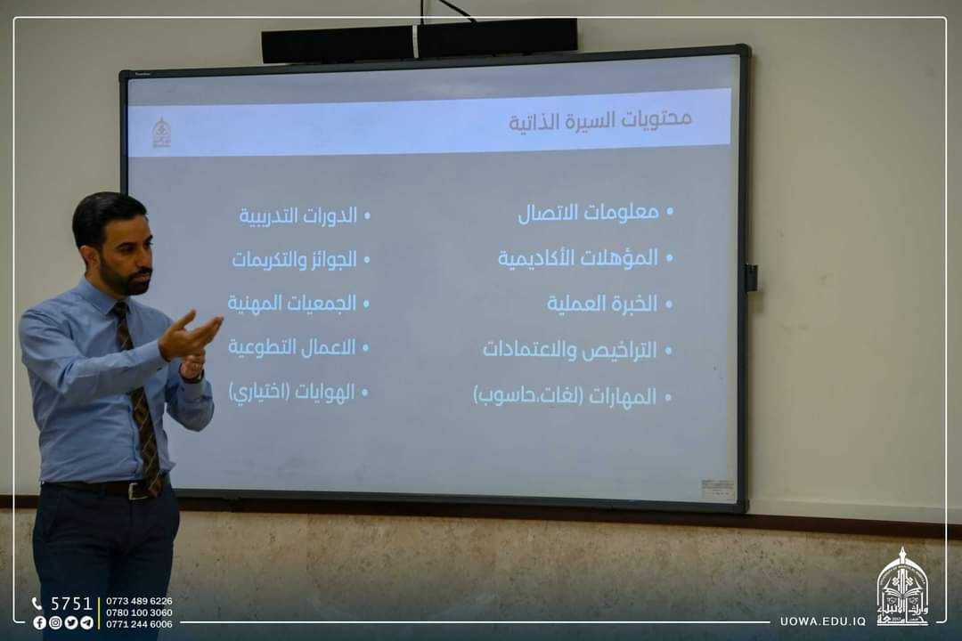 اقامت "شعبة التأهيل والتوظيف والمتابعة"ضمن انشطتها الهادفة لتأهيل خريجي الجامعة دورة تدريبية في "اعداد السيرة الذاتية ودخول سوق العمل" القاها المدرس علي عبد الزهرة هادي رئيس قسم ضمان الجودة.