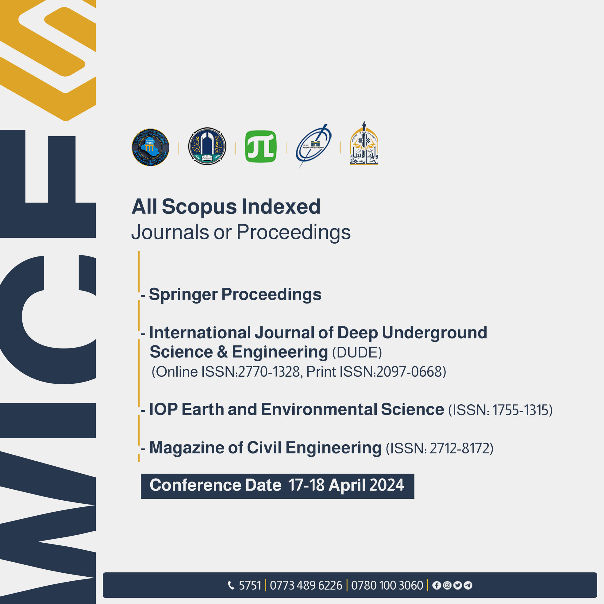 تدعو كلية الهندسة في جامعة وارث الأنبياء (عليه السلام) الأكاديميين، والباحثين في الجامعات والمراكز البحثية، والجمعيات العلمية المحلية والدولية للمشاركة في "المؤتمر الدولي الأول للعلوم الهندسية". يُقام المؤتمر بالتعاون مع الجمعية العلمية الجيوتقنية العراقية وجامعة Saint Petersburg Polytechnic في روسيا.