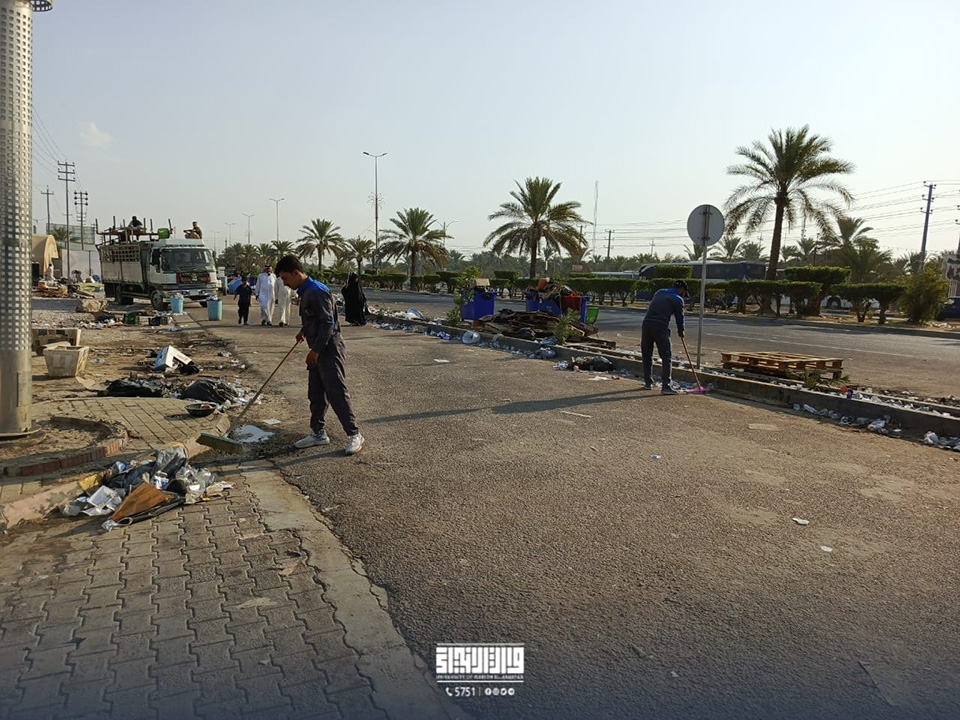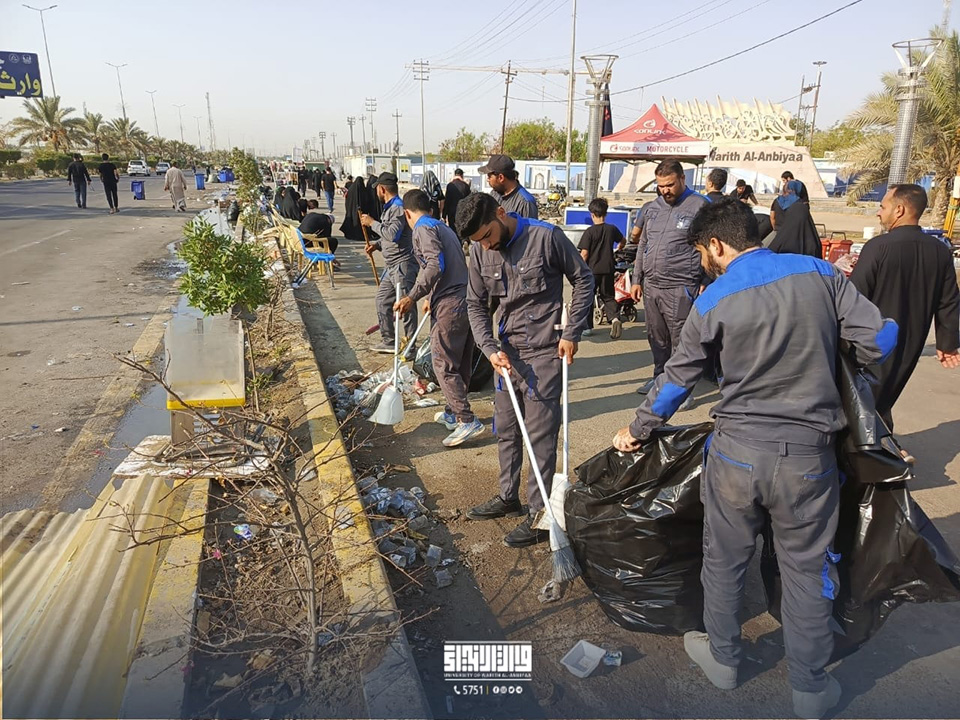 باشر أبطال قسم شؤون الديوان في جامعة وارث الأنبياء (عليه السلام) بحملة تنظيف واسعة للواجهة الأمامية للجامعة وطريق (يا حسين)، بالتعاون مع قسم رعاية الحرم في العتبة الحسينية المقدسة وكوادره المتخصصة.
