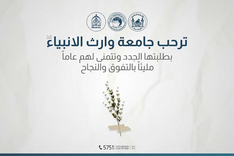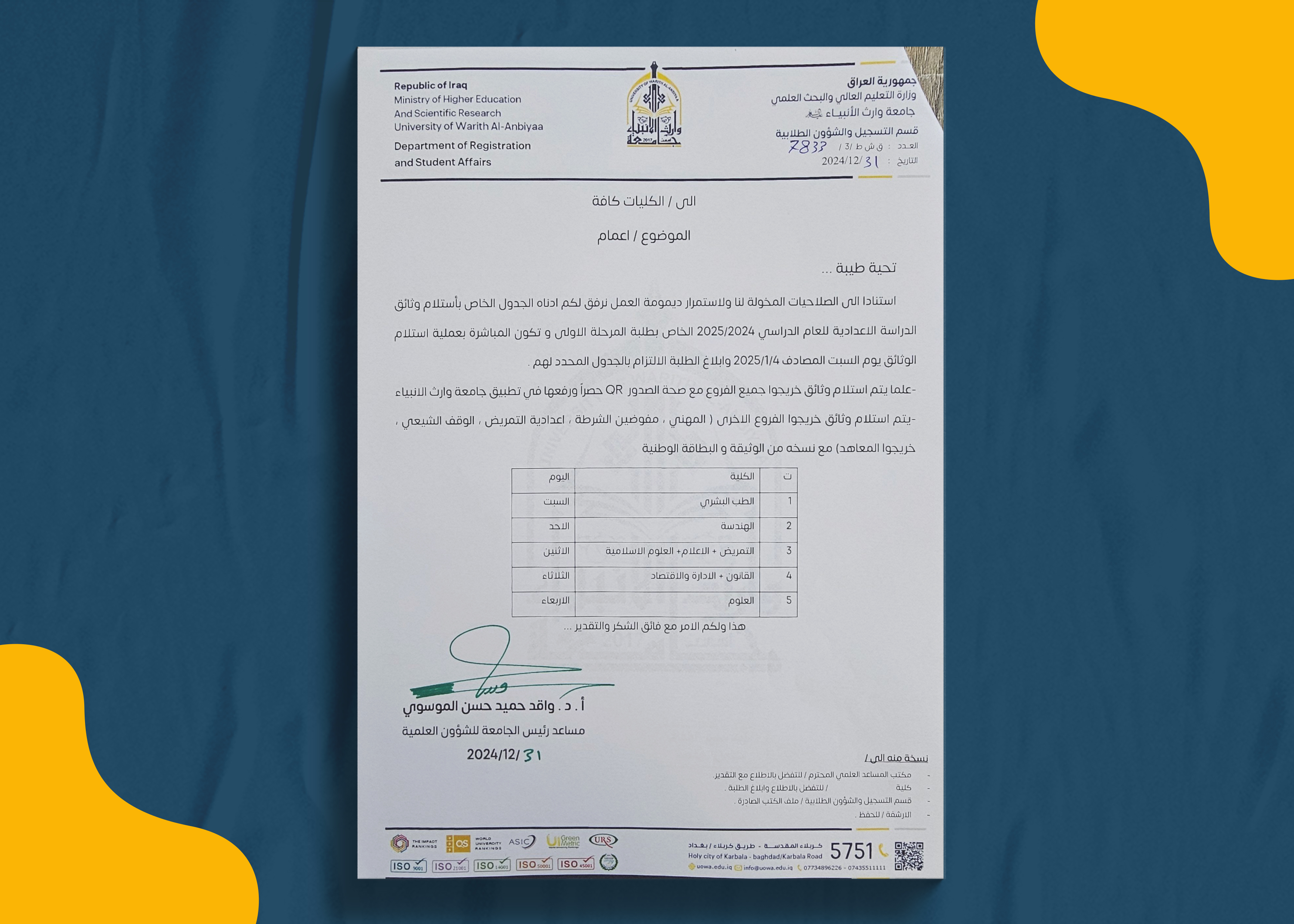 تُعلن جامعة وارث الأنبياء عن بدء استلام وثائق الدراسة الإعدادية لطلبة المرحلة الأولى للعام الدراسي (2024/2025) اعتبارًا من اليوم السبت الموافق 4 يناير 2025.