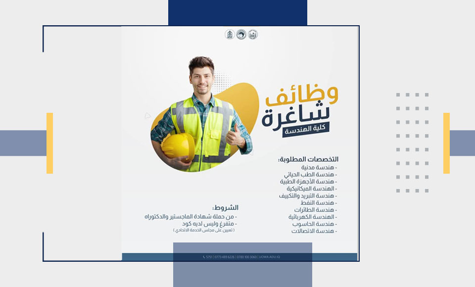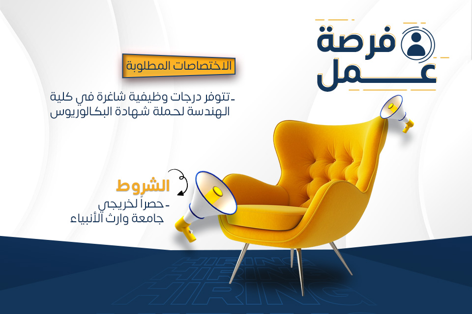 تعلن جامعة وارث الأنبياء (عليه السلام) عن حاجتها الى تدريسيين من حملة شهادة الدكتوراه والماجستير من المتقاعدين أو غير المعينين في جميع التخصصات الهندسية المتوفرة في الجامعة