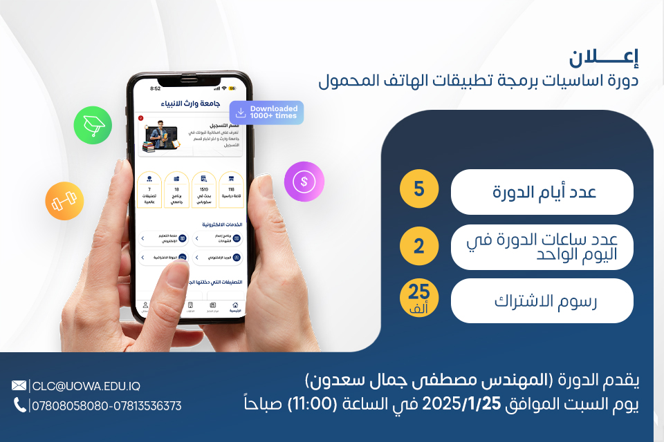يسر مركز التعليم المستمر في جامعة وارث الأنبياء الإعلان عن استمرار التسجيل في دورة أساسيات برمجة تطبيقات الهاتف المحمول، والتي ستبدأ في 27/01/2025، يقدمها (المهندس مصطفى جمال سعدون).