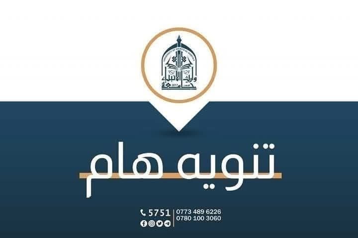 نرجو من طلبتنا الأعزاء الالتزام بالتعليمات والمواعيد المحددة لهم وفق الجدول الخاص بالكليات، مع ضرورة رفع الوثائق عبر تطبيق جامعة وارث الأنبياء.