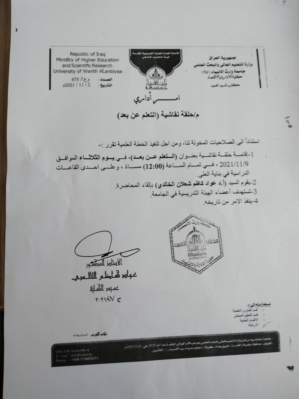 سيتم في يوم الثلاثاء الموافق 9/11/2021 إقامة حلقة نقاشية بعنوان "التعلم عن بعد" يلقيها الأستاذ الدكتور "عواد كاظم الخالدي" تستهدف اعضاء هيئة التدريس في الجامعة.