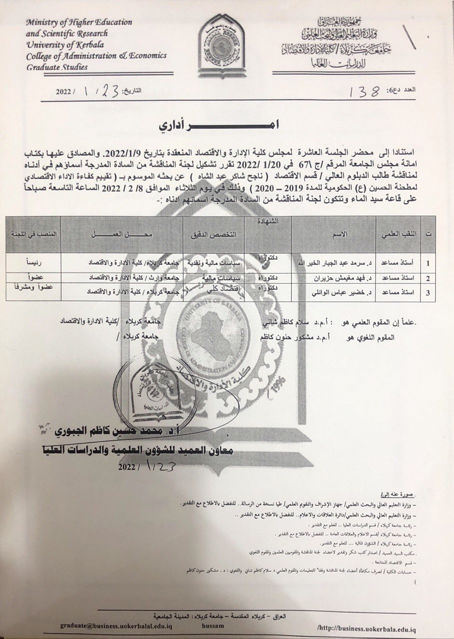 شارك الاستاذ المساعد الدكتور فهد الشمري المعاون العلمي لكليه الادارة والاقتصاد في مناقشة علميه لطالب الدبلوم من قسم الاقتصاد(ناجح شاكر عبد الشاه) عن بحثه الموسوم (تقييم كفاءة الأداءالاقتصادي لمطحنة الحسين ) وذلك في يوم الثلاثاء الموافق ٢٠٢٢/٢/٨ في جامعة كربلاء كليه الادارة والاقتصاد .