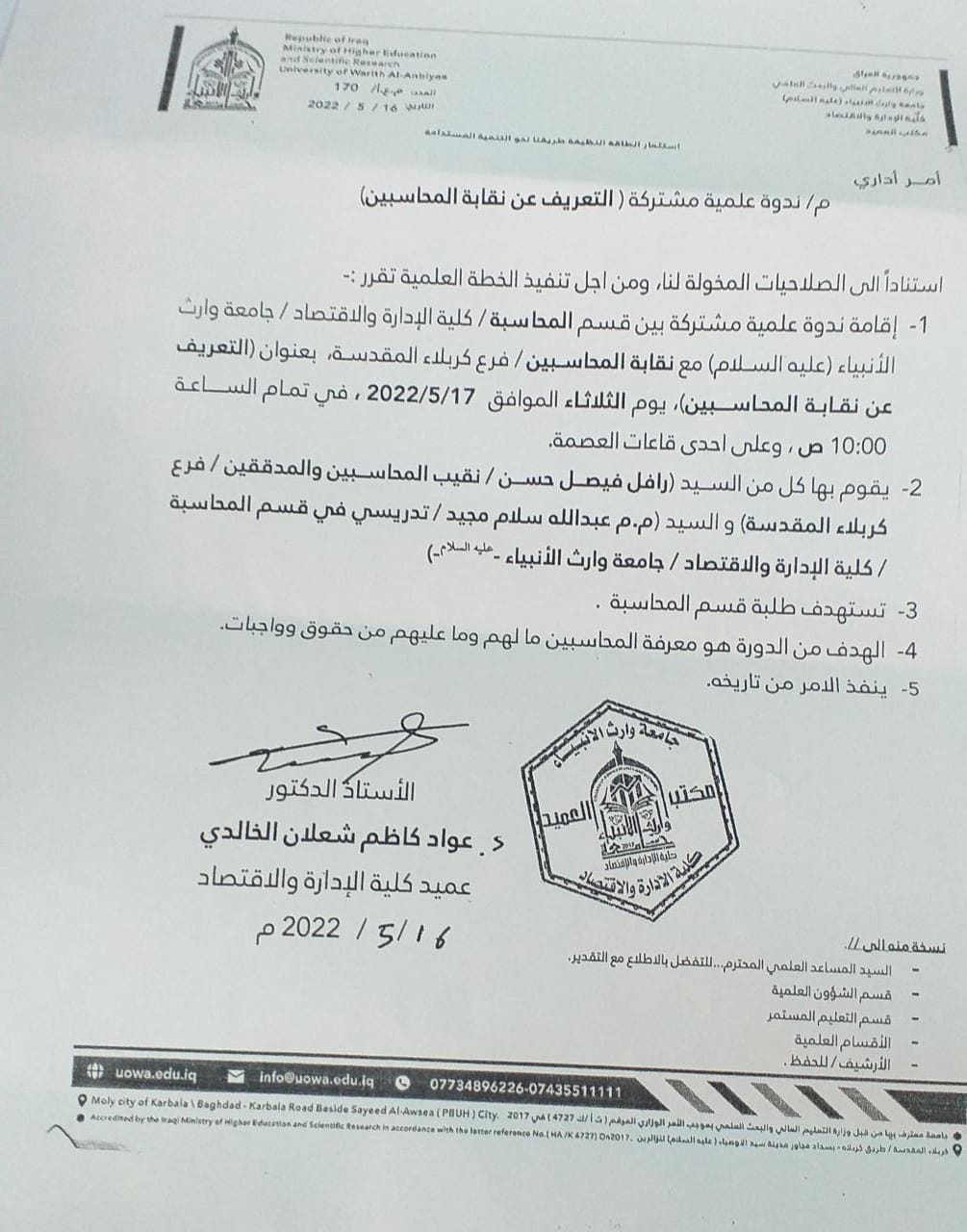 القاها كل من السيد (رافل فيصل حسن / نقيب المحاسبين والمدققين / فرع كربلاء) والسيد (م. م عبدالله سلام مجيد / تدريسي في قسم المحاسبة /كلية الادارة والاقتصاد /جامعة وارث الأنبياء - عليه السلام -) في يوم الثلاثاء الموافق ٢٠٢٢/٥/١٧.