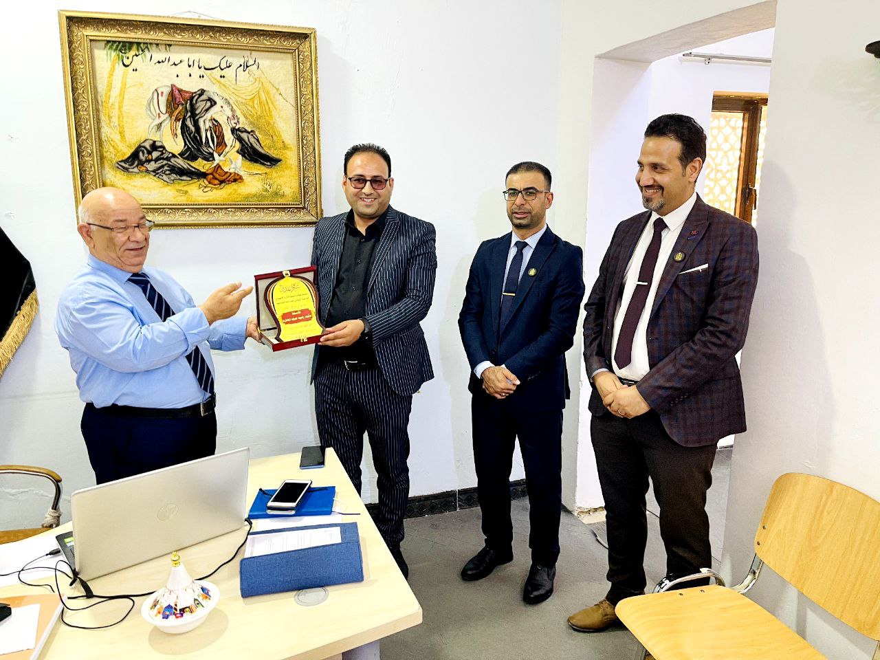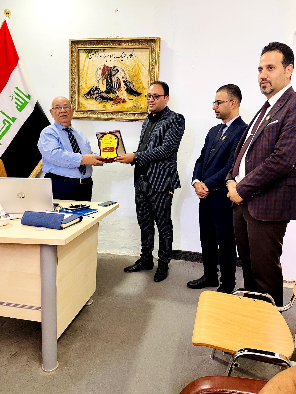 اذ قام السيد عميد الكلية أ.د عواد الخالدي المحترم بتسليمه الدرع نيابة عن الطلبة وبحضور كل من معاون العميد أ.م.د فهدي الشمري ورئيس القسم م.د محمد مجيد الحمداني ومقرر القسم م.د حسين محمد علي كشكول ومجموعة من طلبة المرحلة الاولى/ الدراسه المسائية