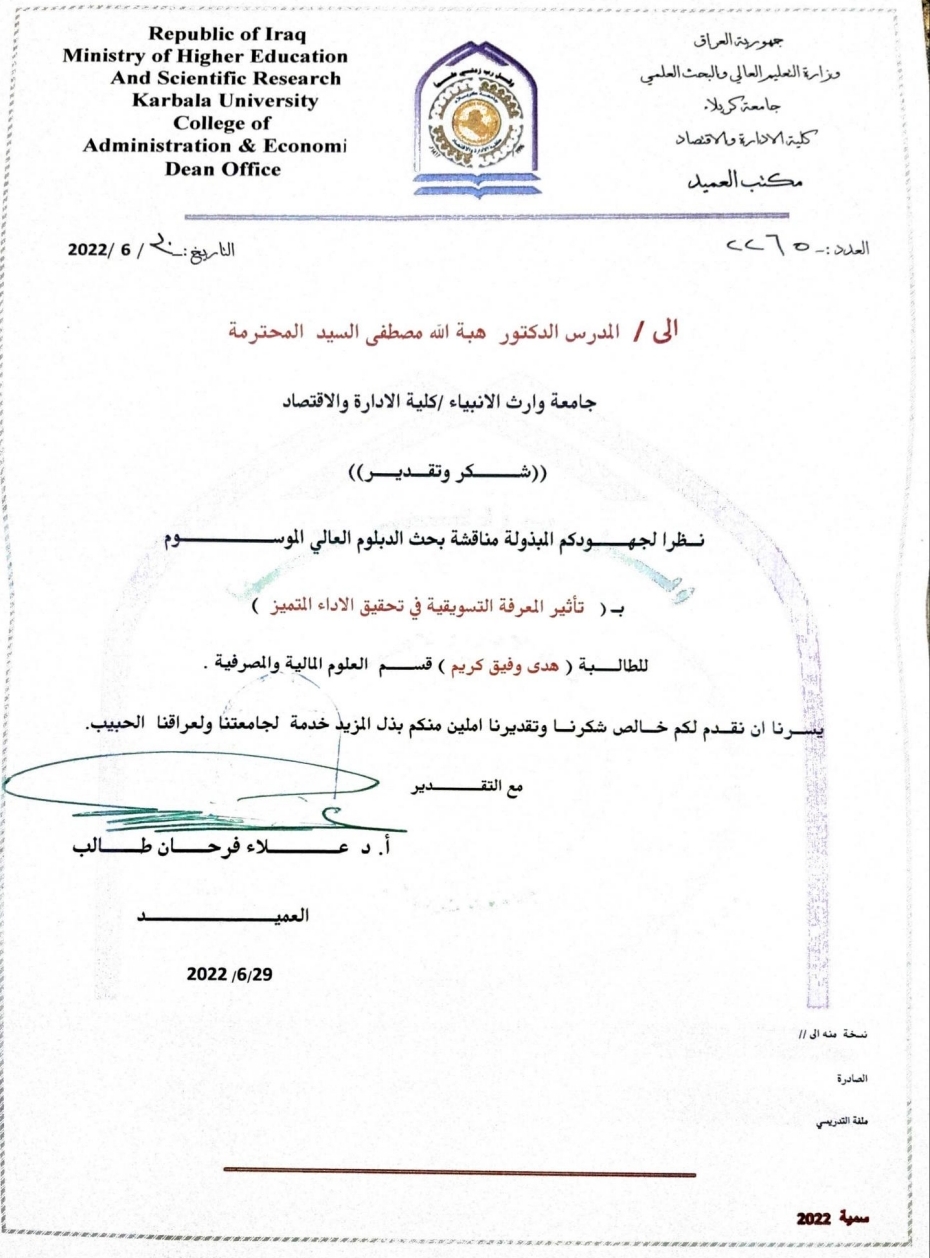 اشتركت رئيس قسم إلمحاسبه الدكتورة هبة الله مصطفى بمناقشة بحث الدبلوم العالي للطالبة (هدى وفيق كريم) في قسم إلعلوم الماليه والمصرفيه /ادارة مصارف والموسومة ب( تأثير المعرفة التسويقيه في تحقيق الاداء المتميز) وذلك في يوم الخميس الموافق ٣٠ حزيران 2022 فكل التوفيق والسداد للطالبة والمشرفة والسادة والسيدات أعضاء لجنة المناقشة الأفاضل .