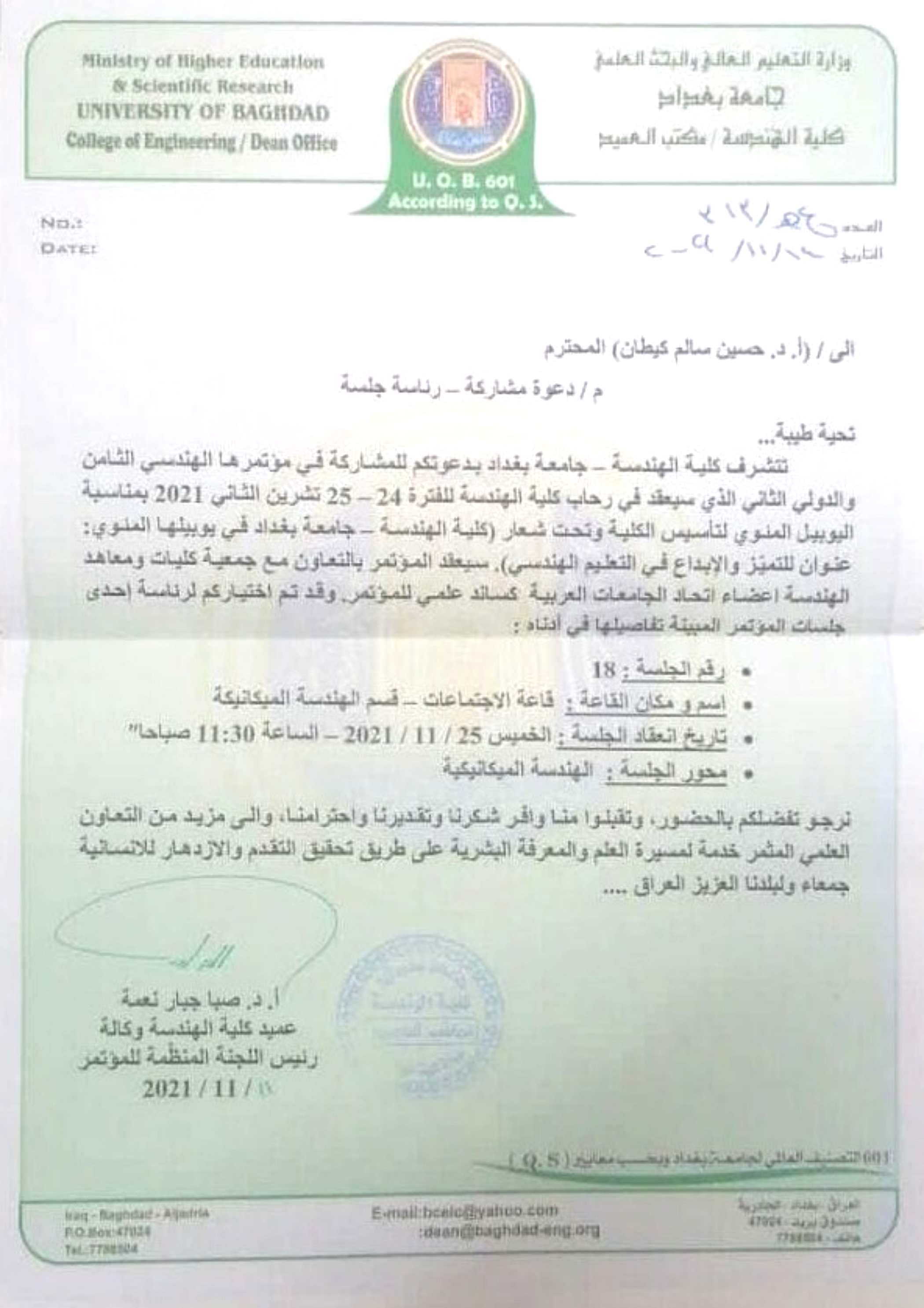 شارك السيد رئيس قسم هندسة الطب الحياتي في كلية الهندسة جامعة وارث الأنبياء في المؤتمر الهندسي الثامن والدولي الثاني لجامعة بغداد كليه الهندسة رئيساً لأحدى جلسات المؤتمر حيث عقد المؤتمر في رحاب كلية الهندسة جامعة بغداد للفترة 24-25 تشرين الثاني 2021.