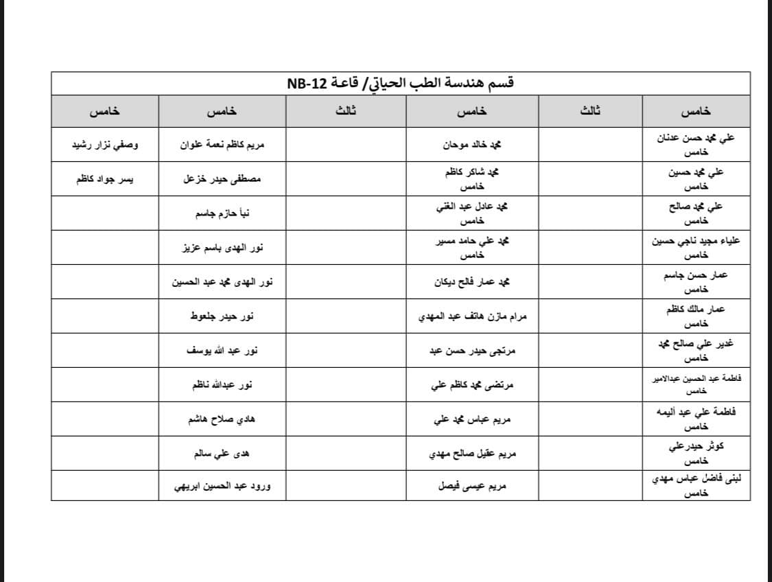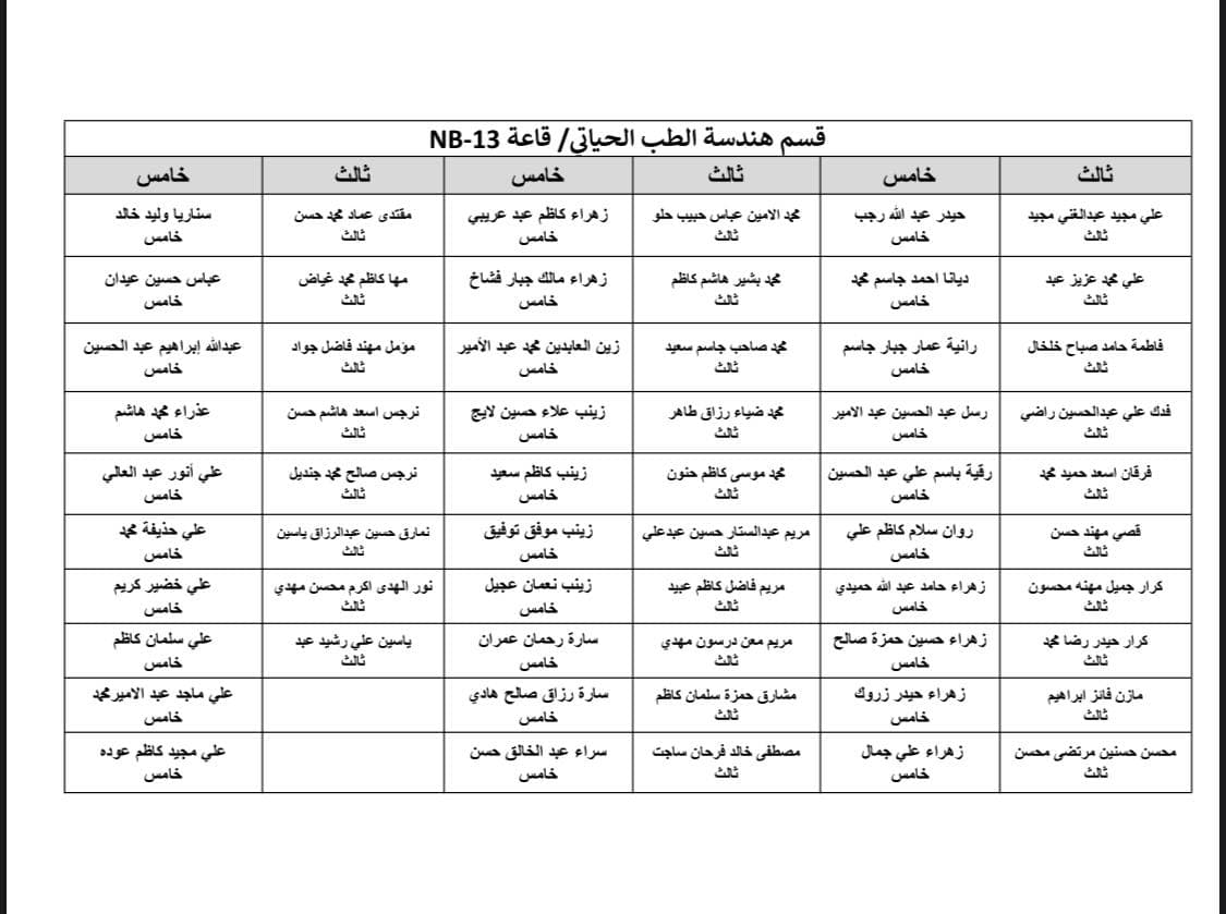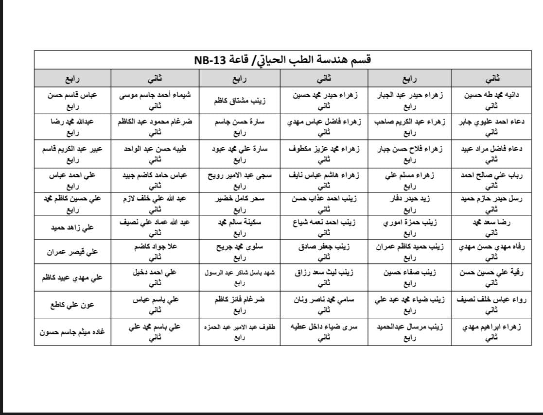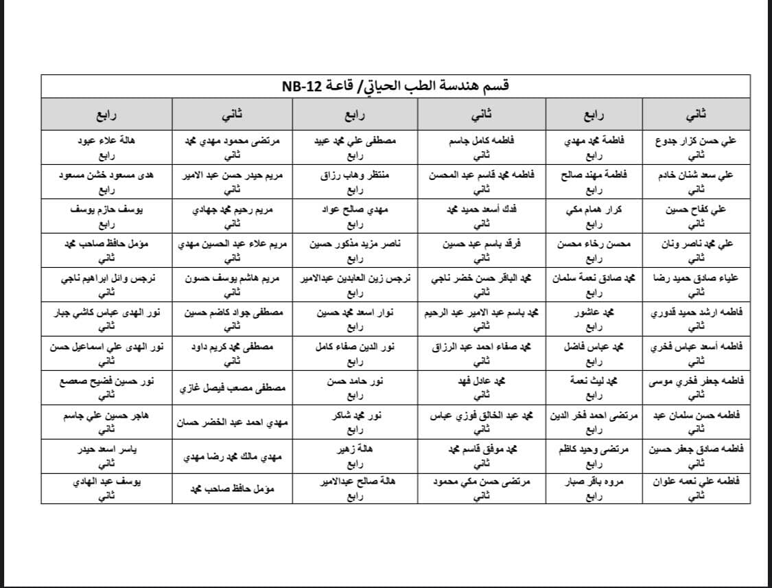 جدول الامتحانات النهائية للفصل الاول لقسم هندسة الطب الحياتي و خارطة توزيع الطلاب في القاعات