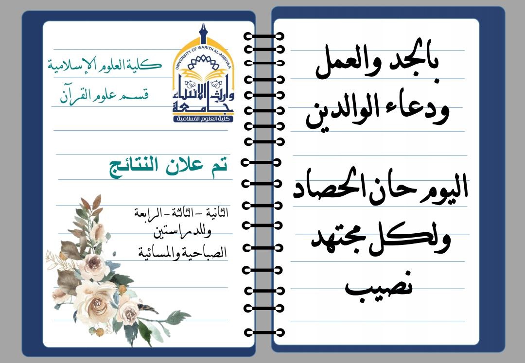 بفرحة وبهجة كبيرة، تعلن كلية العلوم الإسلامية في جامعة وارث الأنبياء (ع) عن بدأ توزيع نتائج امتحانات الفصل الأول 2023-2024 يوم الأحد، الموافق 28 يناير 2024.