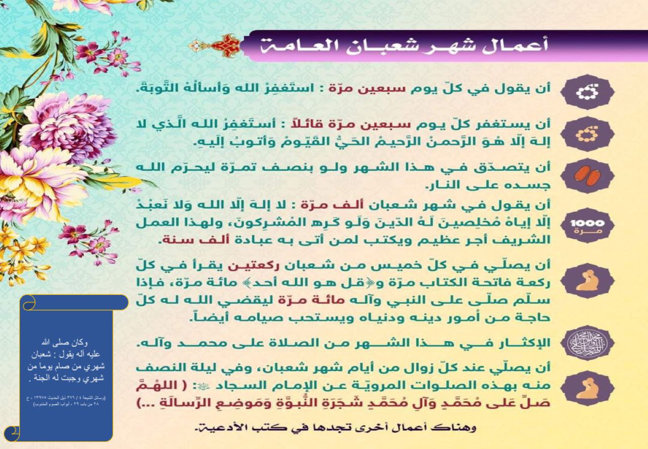 زيارة الحسين(عليه السلام)، فعن ابن أبي نصر أنه قال : سأَلت أبا الحسن الرضا عليه السلام في شهر نزور الحسين (عليه السلام ) ؟ قال : في النصف من رجب والنصف من شعبان .