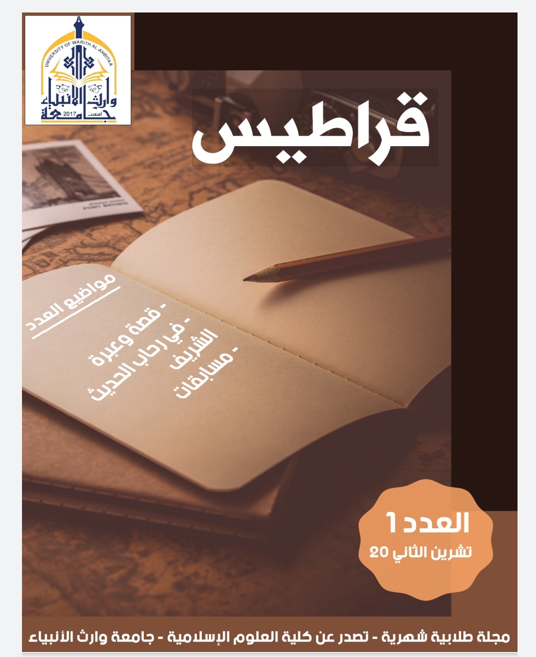تدعوا كلية العلوم الإسلامية في جامعة وارث الانبياء طلبة الجامعة كافة ولمن يرغب بالنشر في إعداد مجلة قراطيس الطلابية والتي تصدر عن كلية العلوم الإسلامية والتي تعنى بنشر مقالات وأبحاث الطلبة مراجعة سكرتارية عمادة الكلية لتقديم ما يرغبون بنشره لعرضه على هيأة التحرير مع ضرورة ترك ارقام الهواتف للتواصل معهم...
