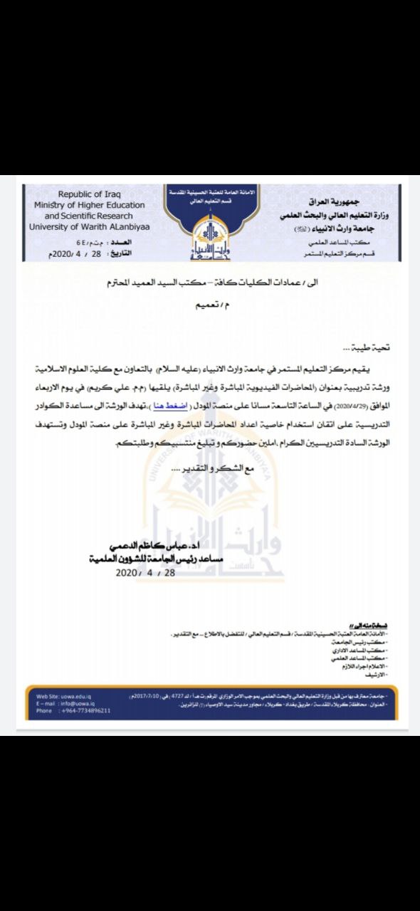 وسيكون هناك ندوة الكترونية مباشرة في الساعة التاسعة من مساء يوم الخميس الموافق ٢٠٢٠/٤/٣٠ تلقى فيها كلمة للسيد عميد الكلية ورئيسي القسمين المحترمين وبحضور الكادر التدريسي .