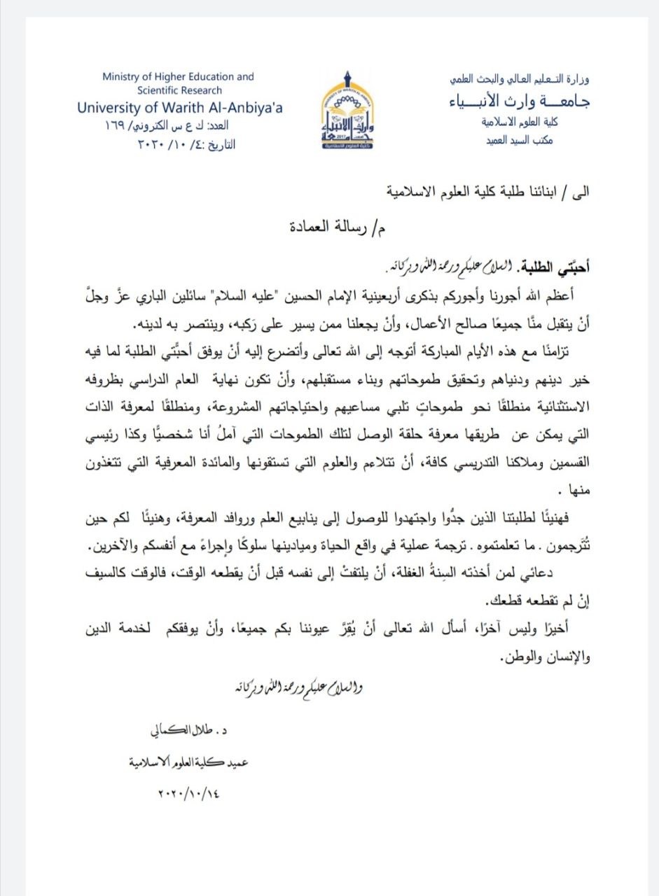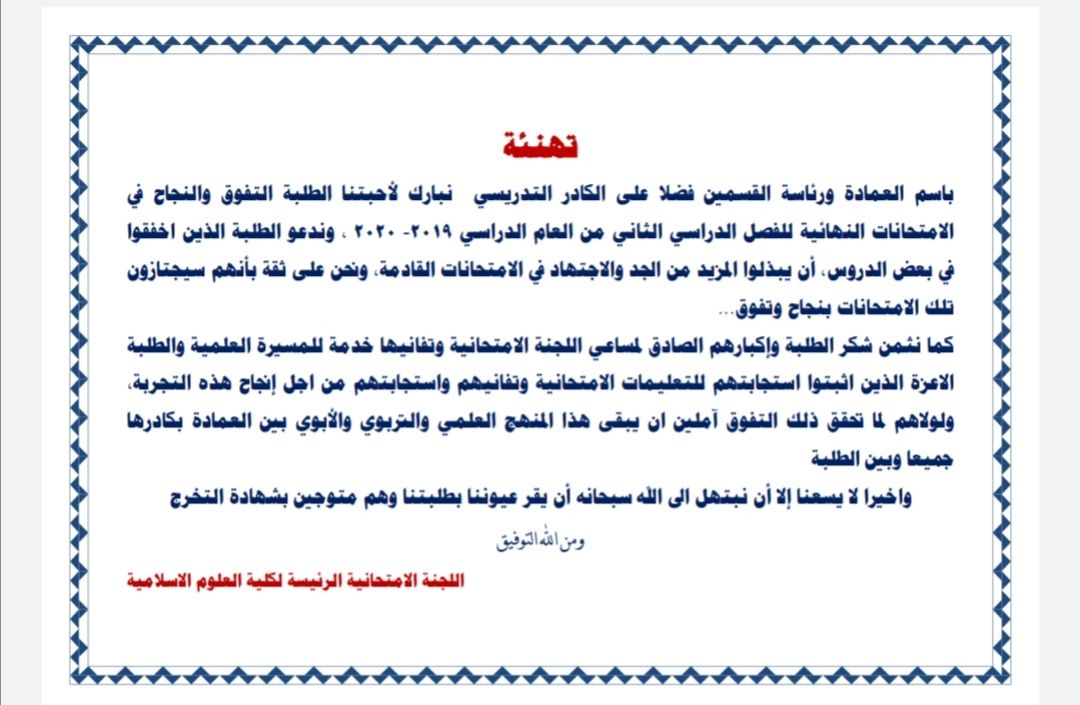 طلبتنا الاعزاء تبعث اليكم عمادة كلية العلوم الاسلامية وكادرها التدريسي بأطيب تحاياها ..