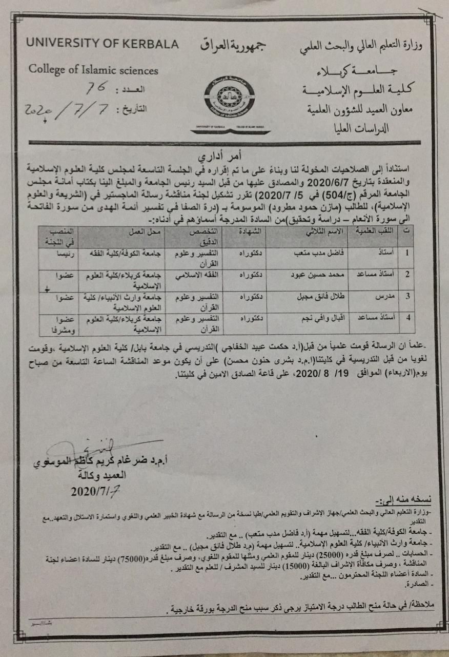 شارك الدكتور ( طلال فائق الكمالي) في لجنة مناقشة رسالة الماجستير الموسومة ب ( درة الصفا في تفسير أئمة الهدى من سورة الفاتحة إلى سورة الأنعام _ دراسة وتحقيق) في جامعة كربلاء / كلية العلوم الإسلامية في يوم الأربعاء الموافق 19 /8 /2020 على قاعة الصادق الأمين.