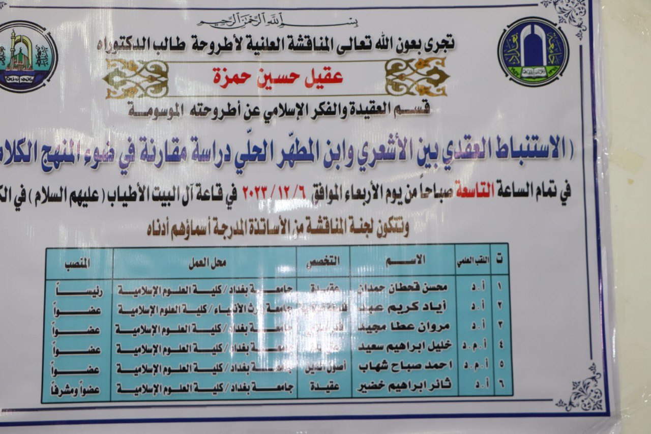 شارك ا.د أياد كريم عبد، أستاذ في كلية العلوم الإسلامية بجامعة الوارث، كعضو في لجنة مناقشة أطروحة الدكتوراه للطالب عقيل حسين حمزة. وتمت المناقشة في قسم العقيدة والفكر الإسلامي حول أطروحة بعنوان "الاستنباط العقدي بين الأشعري وابن المطهر الحلي: دراسة مقارنة في ضوء المنهج الكلام."