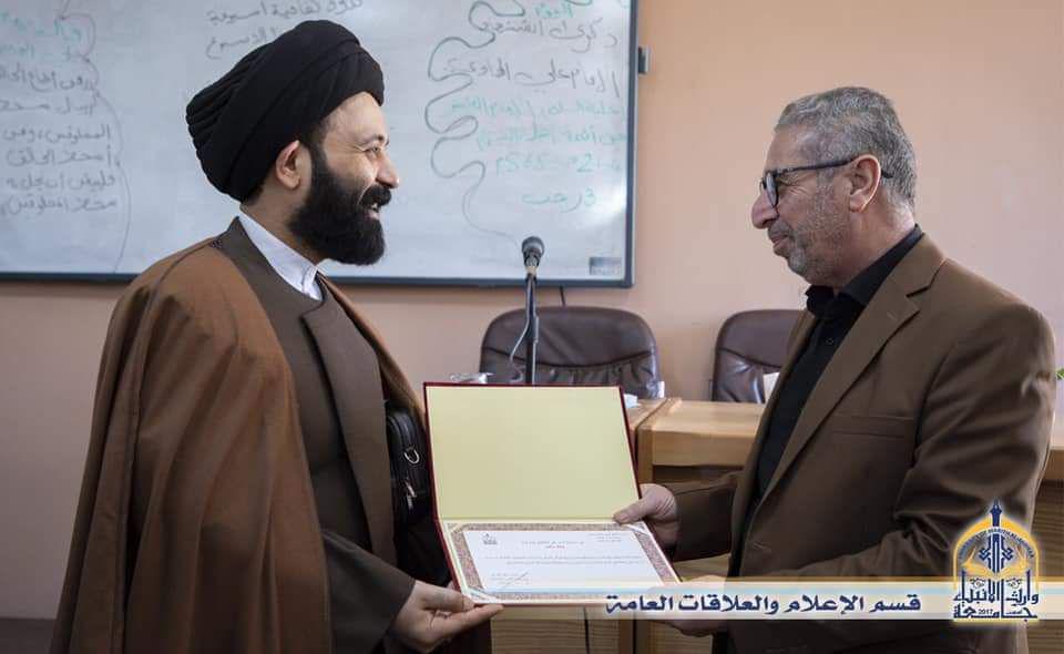 حل السيد علي الطالقاني ضيفاً على جامعة وارث الانبياء يوم الاثنين الموافق 11/3/2019 ضمن برنامج كلية العلوم الاسلامية باقامة ندوات ثقافية اسبوعية لتوعية الطلبة وارشادهم . وافتتح هذا الاسبوع بمحاضرة للسيد علي الطالقاني حيث مثلت ملتقى ثقافي وكان لها حضور وتفاعل متميز من طلاب الجامعة عرض بها الطالقاني اهم مسائل الشباب والمعوقات التي يواجهونها في حياتهم ليصلوا الى معطيات الحل عن طريق بيان مهمة الشباب والعمل الجاد في تبني المهام الموكلة اليهم