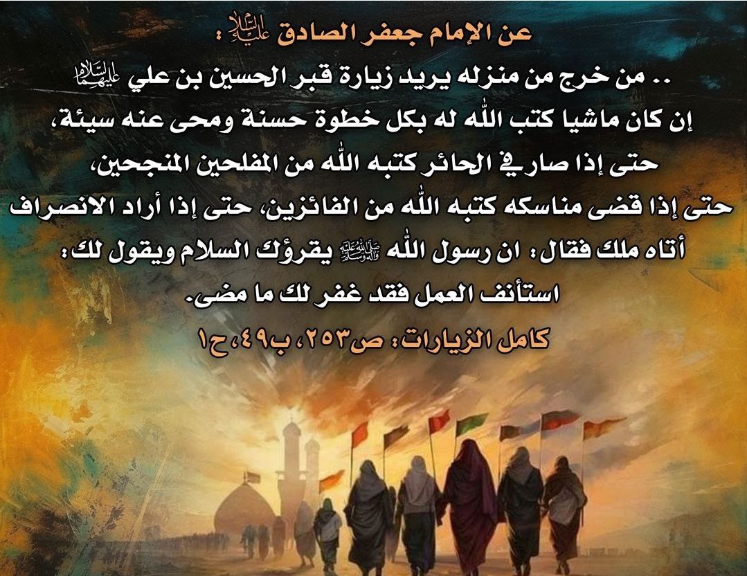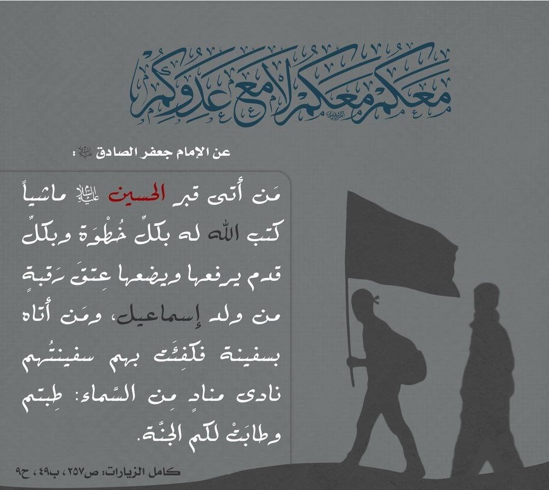 الى مقام صاحب العصر والزمان (عجل الله فرجه الشريف) ومراجعنا العظام والأمّة الإسلامية جمعاء بذكرى اربعينية الامام الحسين(عليه السلام) في العشرين من صفر الخير فسلامٌ عليك سيدي ولا حرمنا الله زيارتك في الدنيا وشفاعتك في الآخرة