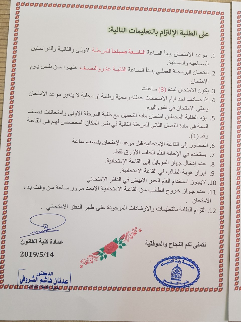 3.      اذا صادف احد ايام الامتحانات عطلة رسمية او حظر للتجوال يحدد الموعد بتاريخ لاحق