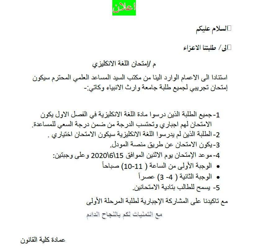 السلام عليكمالى/ طلبتنا الاعزاءم /إمتحان اللغة الانكليزياستنادا الى الاعمام الوارد الينا من مكتب السيد المساعد العلمي المحترم سيكونإمتحان تجريبي لجميع طلبة جامعة وارث الانبياء وكاتي:-1- جميع الطلبة الذين درسوا مادة اللغة الانكليزية في الفصل الاول يكونالامتحان لهم اجباري وتحتسب الدرجة من ضمن درجة السعي للمساعدة.2- الطلبة الذين لم يدرسوا اللغة الانكليزية سيكون الامتحان اختياري .3- يكون الامتحان عن طريق منصة المودل .4- موعد الإمتحان يوم الاثنين الموافق 15 \ 6 \ 2020 وعلى وجبتين : الوجبة الأولى من الساعة ) 11 - 10 ( صباح ا الوجبة الثانية ) 4 - 3( عصر ا5- يسمح للطالب بتادية الامتحانين .مع تاكيدنا على المشاركة الإجبارية لطلبة المرحلة الأولىعمادة كلية القانون