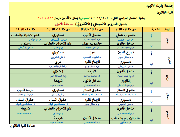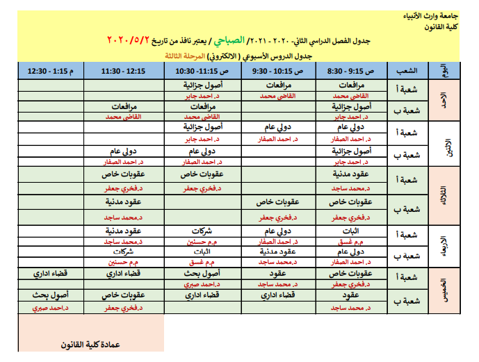جدول المحاضرات الاسبوعية الالكتروني للدارسة الصباحية للفصل الدراسي الثاني