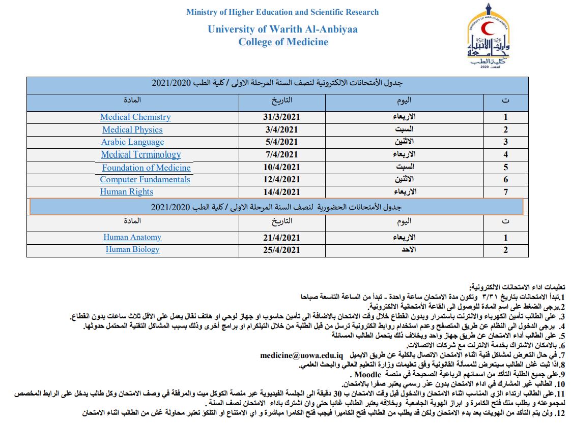 كلية الطب جامعة وارث الأنبياء عليهم السلام تستكمل الامتحانات الحضورية النهائية التي جرت بشكل جيد ولم تكن هناك اي معوقات نتيجة الجهود المتظافرة من قبل العمادة و اللجنة الامتحانية. و استمرار الامتحانات النهائية الالكترونية بأشراف السيد عميد كلية الطب الاستاذ الدكتور فالح البياتي المحترم، كما اكد على الالتزام بالوقاية الصحية من خطر انتقال العدوى حسب وتوجيهات وزارة التعليم العالي ووزارة الصحة
