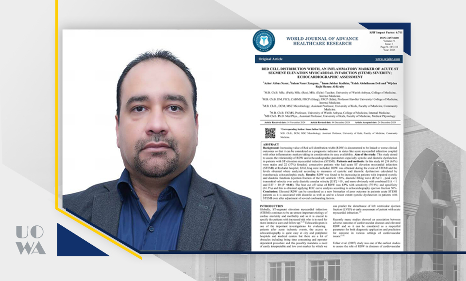 ُشر مؤخرًا بحث علمي جديد للدكتور أزهر عباس ناصر، التدريسي في كلية الطب – جامعة وارث الأنبياء، في المجلة العالمية World Journal of Advance Healthcare Research، حيث تناول فيه عرض توزيع خلايا الدم الحمراء (RDW) كمؤشر التهابي لشدة احتشاء عضلة القلب الحاد (STEMI)، وذلك باستخدام التقييم بالإيكوكارديوغراف.