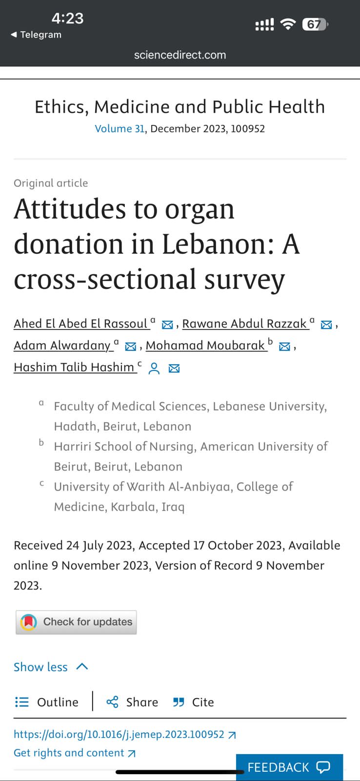 نشر بحث بعنوان:“Attitudes to organ donation in Lebanon: A cross-sectional survey”في مجلة Ethics, Medicine and public health وهي احدى المجلات التي تندرج ضمن مستوعب سكوبص ومستوعب PubMed وكان البحث بالمشاركة بين قسم البحوث في جامعة وارث الانبياء كلية الطب متمثلاً بالطبيب هاشم طالب هاشم ومجموعة من الاطباء الباحثين في الجامعة الامريكية في بيروت وتناول البحث اساليب وسلوكيات التبرع بالاعضاء في لبنان.