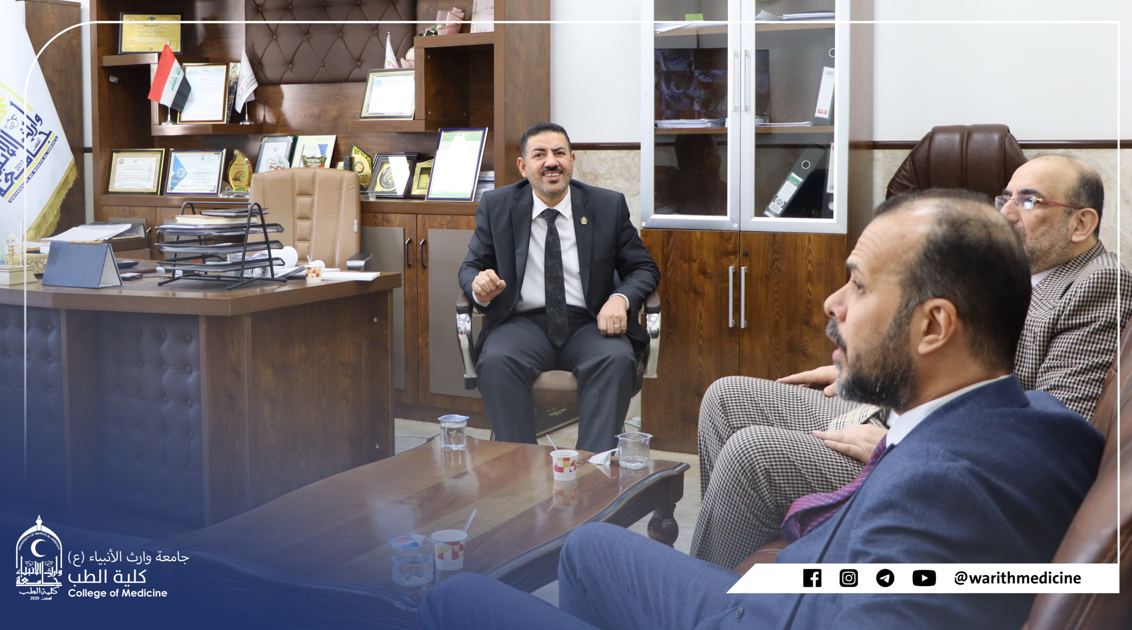 استقبل عميد كلية الطب جامعة وارث الانبياء (ع) الاستاذ الدكتور علي عبد سعدون الغزي المحترم الدكتور معد نصيف جاسم استشاري الكلية الملكية البريطانية حيث تم القاء حول إمكانية انشاء مركز طب الطوارئ والكوارث بتعاون مع الكلية الملكية البرطانية وفتح قنوات تعاون بين كلية الملكية البرطانية وجامعة وارث الانبياء (ع) حيث اطلع الوفد على البنى التحتية والموارد البشرية في الجامعة.