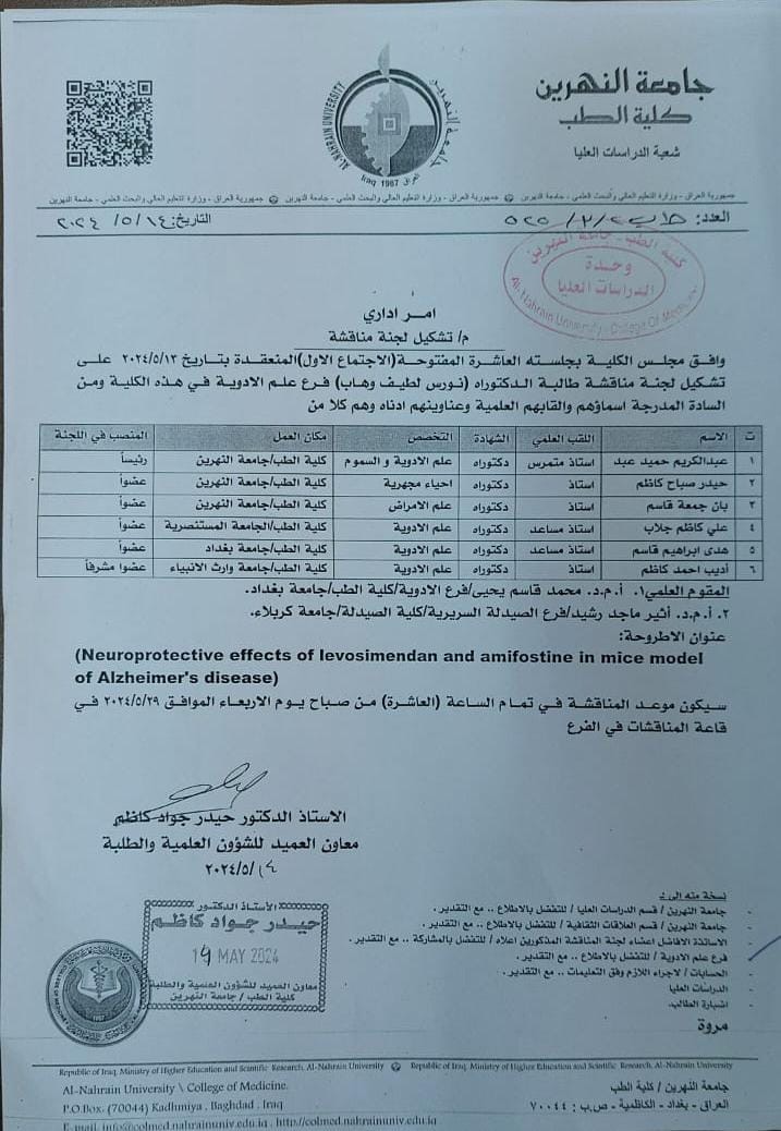 شارك الأستاذ الدكتور أديب أحمد الزبيدي رئيس فرع علم الأدوية في كلية الطب - جامعة وارث الانبياء (عليه السلام) يوم الاربعاء الموافق 2024/5/29 (عضواً ومشرفاً) في لجنة مناقشة أطروحة طالبة الدكتوراه( نورس لطيف وهاب) في فرع علم الأدوية - كلية الطب / جامعة النهرين والموسومة: