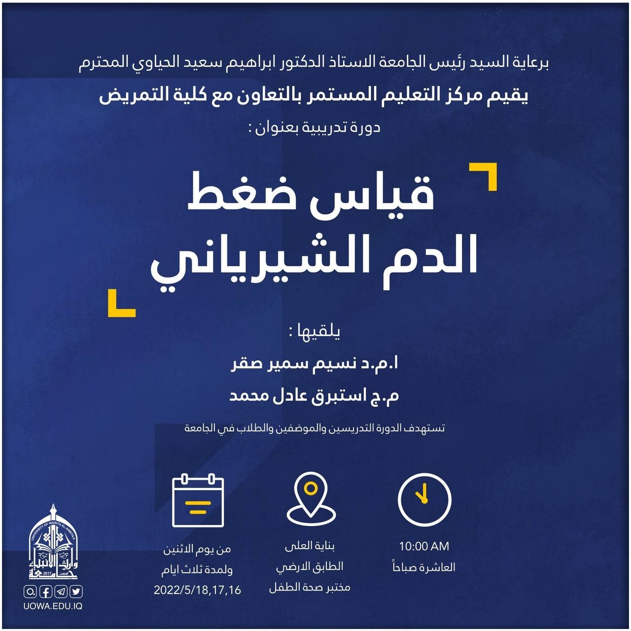 برعاية السيد رئيس الجامعة المحترم يقيم قسم التعليم المستمر بالتعاون مع كلية العلوم الإسلامية في جامعة وارث الانبياء دورة تدريبية حول شروط وضوابط الترقيات العلمية تقدمها أ.م.د. نور مهدي الساعدي