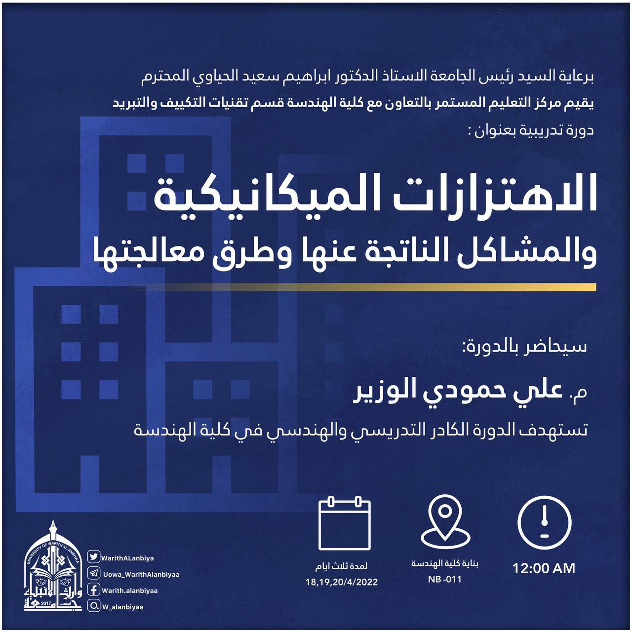 برعاية رئيس الجامعة الاستاذ الدكتور ابراهيم الحياوي يقيم مركز التعليم المستمر وبالتعاون مع كلية الهندسة/ قسم تقنيات التبريد والتكييف دورة تدريبية بعنوان " الاهتزازات الميكانيكية والمشاكل الناتجة عنها وطرق معالجتها"، لمدة ثلاثة أيام (18-19-20 / 4/ 2022).