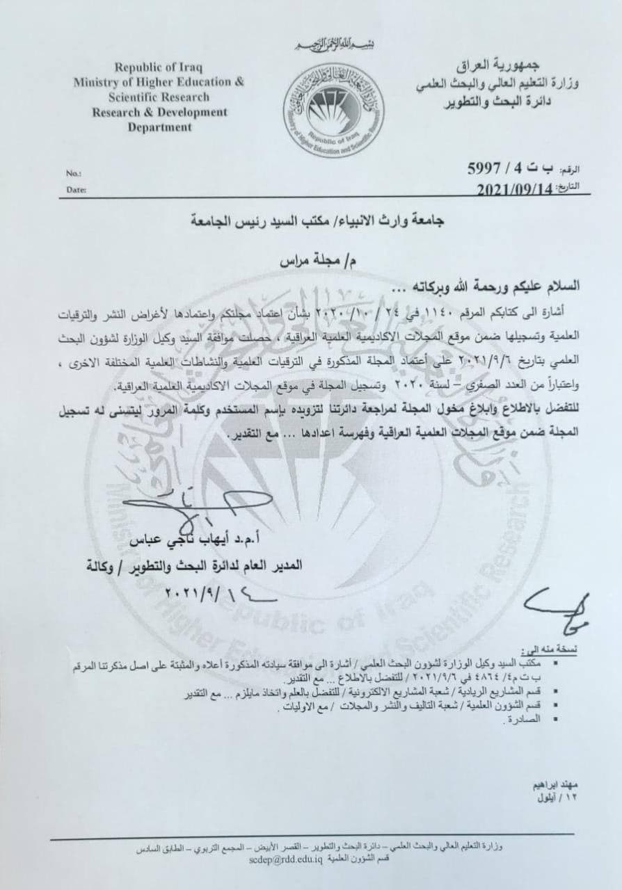 حصول موافقة وزارة التعليم العالي والبحث العلمي على استحداث (مجلة مراس) في جامعة وارث الانبياء (عليه السلام)