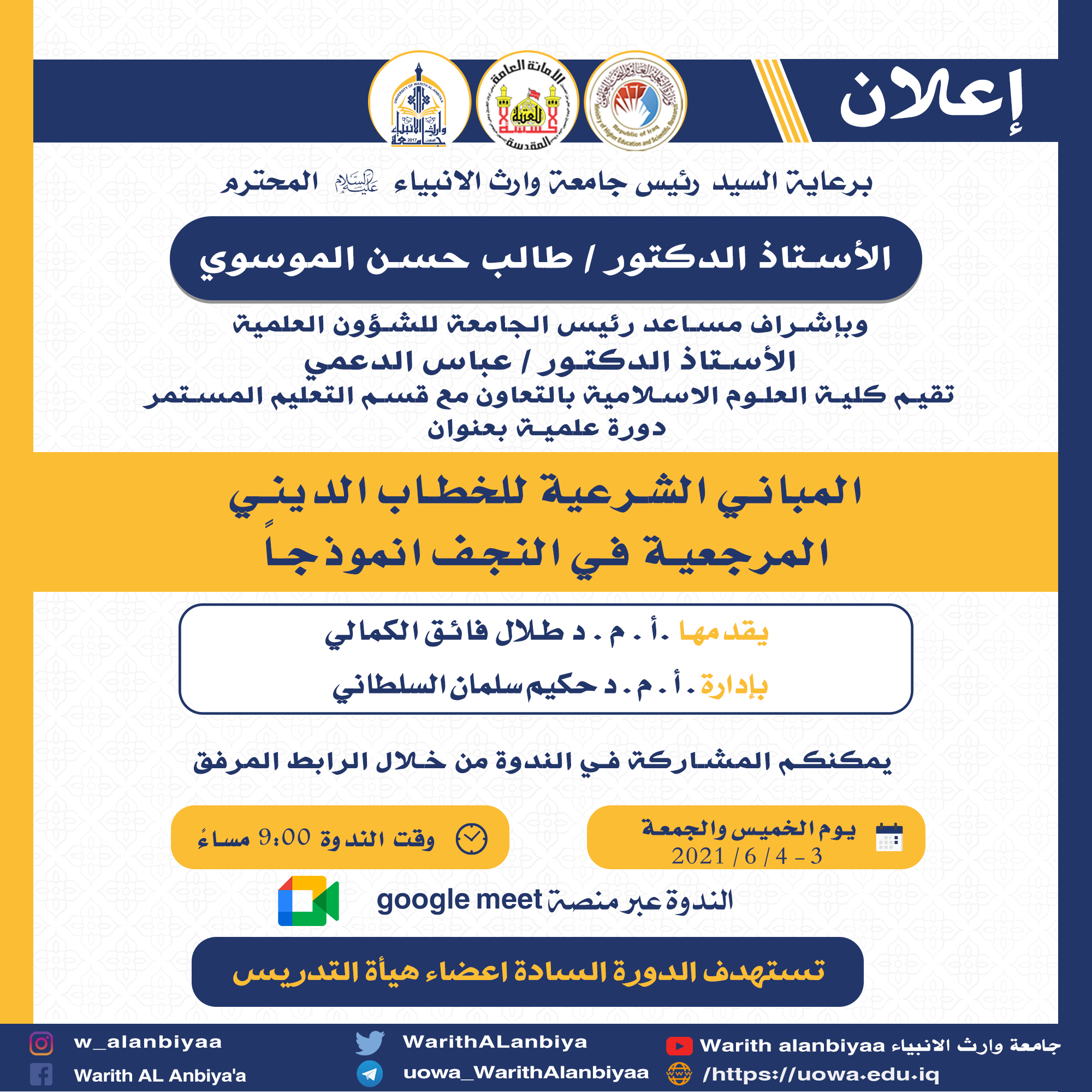 تقيم كلية العلوم الإسلامية بالتعاون مع مركز التعليم المستمر في جامعة وارث الأنبياء دورة علمية بعنوان المباني الشرعية في الخطاب الديني المرجعية الدينية في النجف انموذجا يقدمها ا. م. د طلال فائق الكمالي وبادارة ا. م. د حكيم السلطاني وذلك في يومي الخميس والجمعة الموافق ٣ _ ٤ / ٦ / ٢٠٢١ في تمام الساعة التاسعة مساء عبر منصة التعليم الإلكتروني الكوكل ميت