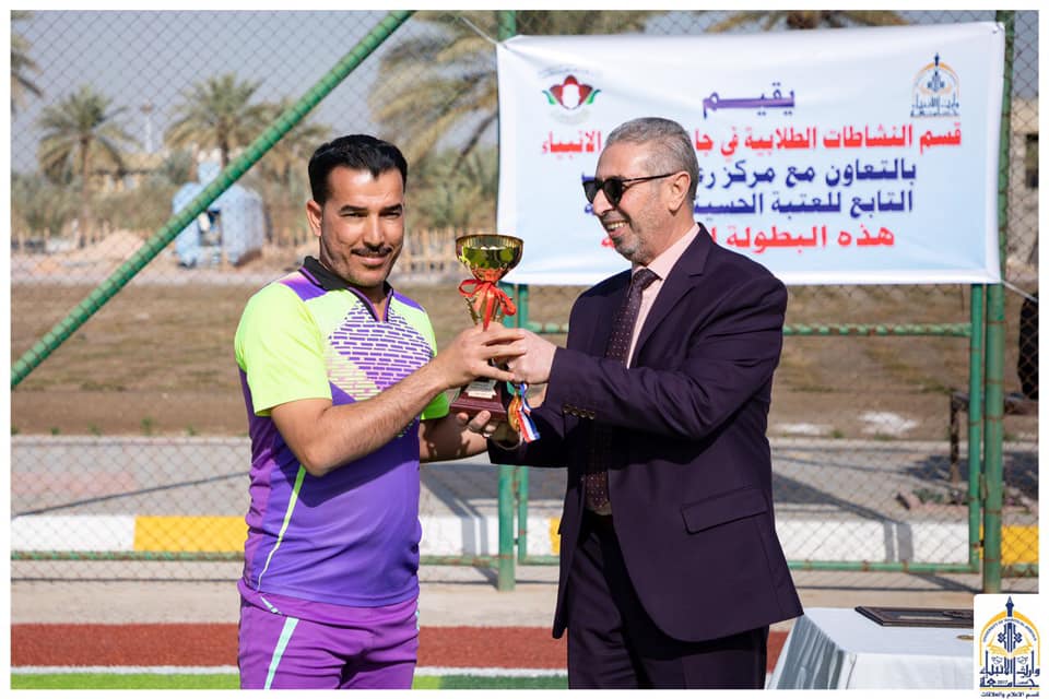 اقام قسم النشاطات الطلابية في جامعة وارث الانبياء(عليه السلام) بطولة الاحرار الرياضية لخماسي الكرة بالتعاون مع مركز رعاية الشباب التابع للعتبة الحسينية المقدسة بمشاركة كليات واقسام الجامعة ، وعن هذه البطولة تحدث السيد رئيس قسم الانشطة الطلابية الدكتور همام الخفاجي قائلاً :افتتحت بطولة الأحرار لخماسي كرة القدم بقراءة سورة الفاتحة على أرواح شهداء العراق كافة ، وكانت بمشاركة 17 فريق من كافة كليات واقسام الجامعة، واعتمدت البطولة نظام التسقيط الفردي للوصول الى النهائيات.واضاف الخفاجي:اقيمت هذه البطولة لاعتبارها جانب ترفيهي يُخرِج الطلبة من روتين الدراسة الى فسحة رياضية تنافسية تتكلل بالتتويج وتقديم الهدايا للفرق الفائزة بالمراتب الأولى فضلا عن تكريم افضل لاعب وافضل حارس مرمى.يذكر ان جامعة وارث الانبياء (عليه السلام) تقيم في كل عام بطولات عديدة بكرة القدم وكرة الطاولة وغيرها من النشاطات الرياضية لطلبتها الاعزاء.