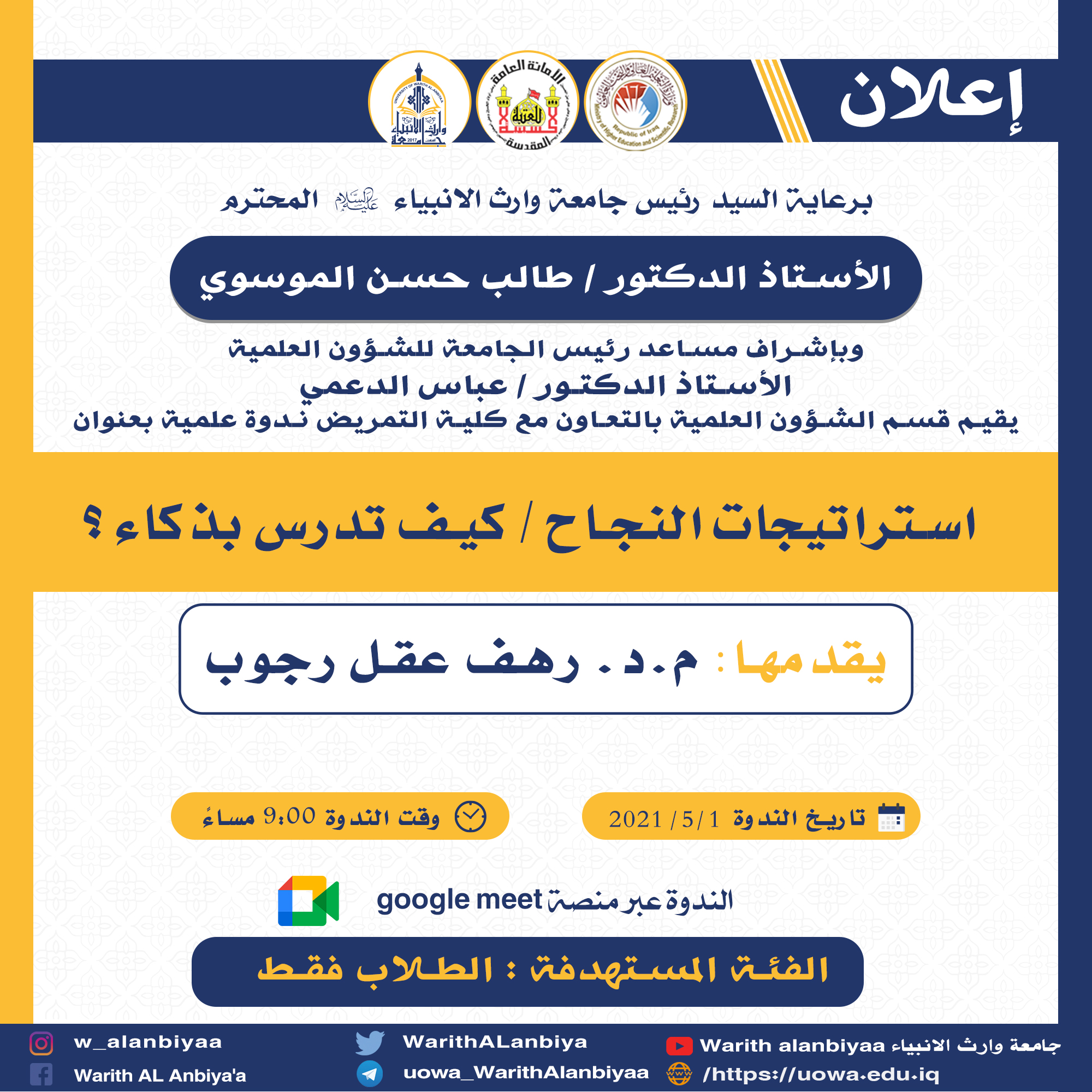 يقيم قسم الشؤون العلمية في جامعة وارث الانبياء(عليه السلام) ندوة علمية إلكترونية عبر منصه كوكل ميت (google meet)ومن خلال الرابط أدناه: meet.google.com/zdu-hvkc-rkk