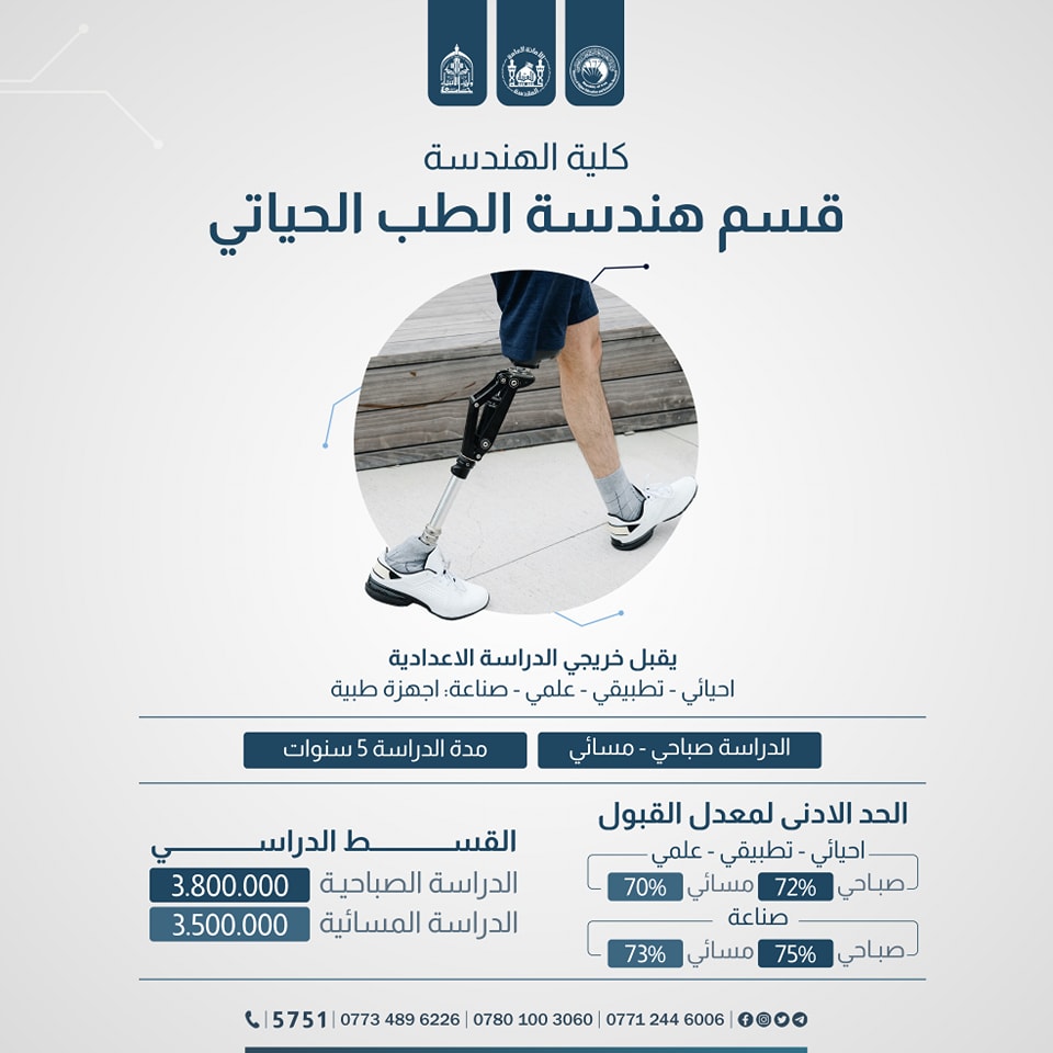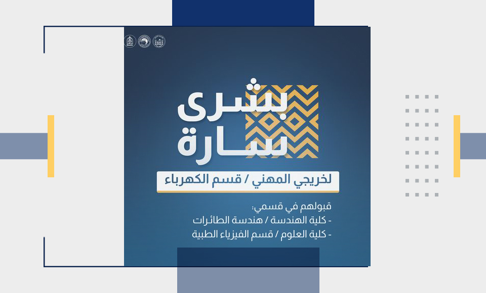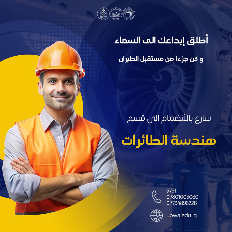 بشرى سارة لخريجي الدراسة الإعدادية فرع المهني / الكهرباء شمولكم بالتقديم على كلية الهندسة قسم هندسة الطائرات ، وكلية العلوم قسم الفيزياء الطبية في جامعة وارث الانبياء(عليه السلام).