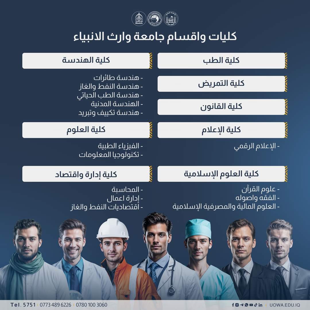 انطلق نحو مستقبلك وأكتشف تخصصات جامعة وارث الأنبياء (عليه السلام) المتنوعة، من المجالات الطبية، الهندسية، والعلوم الإنسانية.