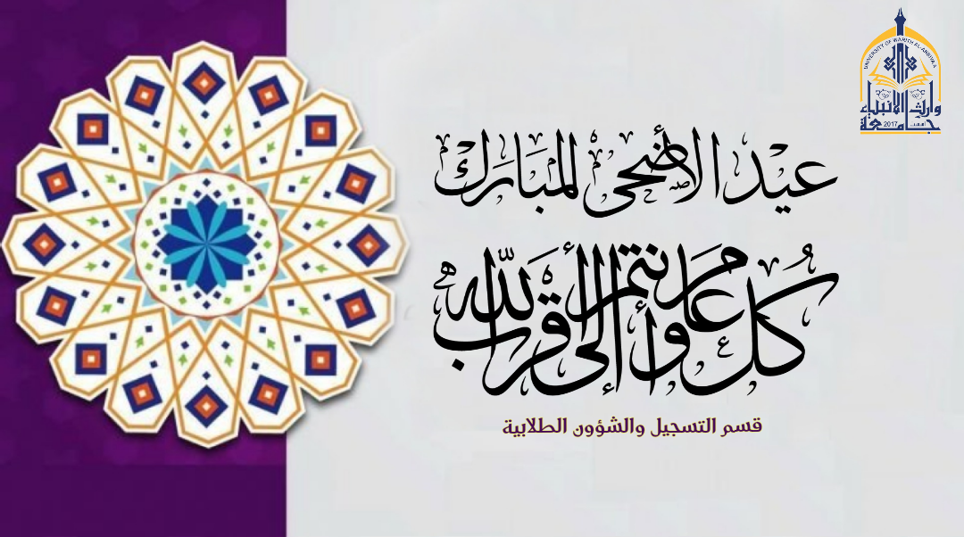 أطيب وازكى التهاني والتبريكات، وخالص الدعاء وأصدق الامنيات، يقدمها قسم التسجيل والشؤون الطلابية في جامعة وارث الأنبياء (عليه السلام) لمقام صاحب العصر والزمان (عجل الله فرجه) ومراجعنا العظام وعلمائنا الأعلام ولكادر وطلبة جامعه وارث الأنبياء وللأمة الاسلامية جمعاء بمناسبة حلول عيد الأضحى المبارك سائلين المولى القدير أن يمنّ على بلدنا بنعمة الأمن والاستقرار، وأن يحفظ وحدته ويرد كيد أعدائه ويرحم شهدائه إنّه سميع مجيب.