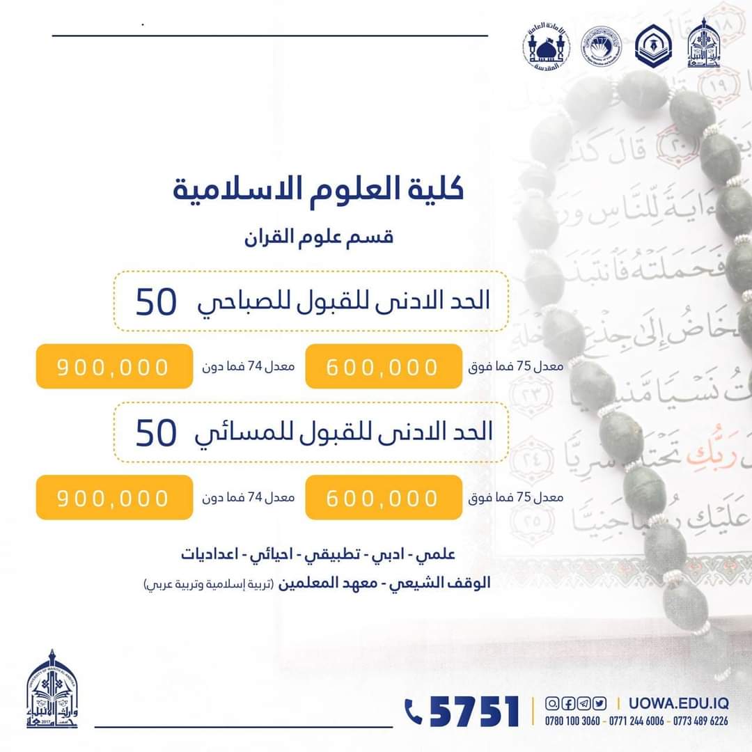 بشرى سارة.مراعاة للضروف التي يمر بها الطلبة تعلن رئاسة جامعة وارث الانبياء(عليه السلام) عن تخفيض اجور بعض كليات الجامعة علماً ان الجامعة سبق وان اجرت تخفيضات كبيرة لاصحاب المعدلات العالية.????طلبتنا الأعزاء #اغتنموا_الفرصة_باختياركم_جامعة_وارث_الانبياء(عليه السلام) نود اعلامكم ان فريق التسجيل متواجد من الساعة ٨صباحاً ولغاية ٥ مساءًلاستقبالكم ومساعدتكم على التقديم والاطلاع على منشآت الجامعة. #جامعة_وارث_الانبياء_عليه_السلام#سندك_الحاضر_ومستقبلك_الأفضل تحتوي الجامعة على ست كليات هي:????️كلية الطب البشري ????️كلية الهندسة و تضم ثلاثة اقسام:هندسة الطب الحياتي هندسة مدنيهندسة تقنيات التبريد والتكييف????️كلية التمريض????️كلية القانون????️كلية الادارة والاقتصاد وتضم:قسم المحاسبة قسم إدارة الأعمال????️كلية العلوم الاسلامية وتضم:قسم علوم القران قسم الفقه وأصوله قسم العلوم المالية والمصرفية الاسلاميللاستفسار يرجى الاتصال على الارقام التالية:الرقم المختصر :5751078010030600771244600607734896226أو زيارة رابط التليكرام أدناه:https://t.me/uowa_reg