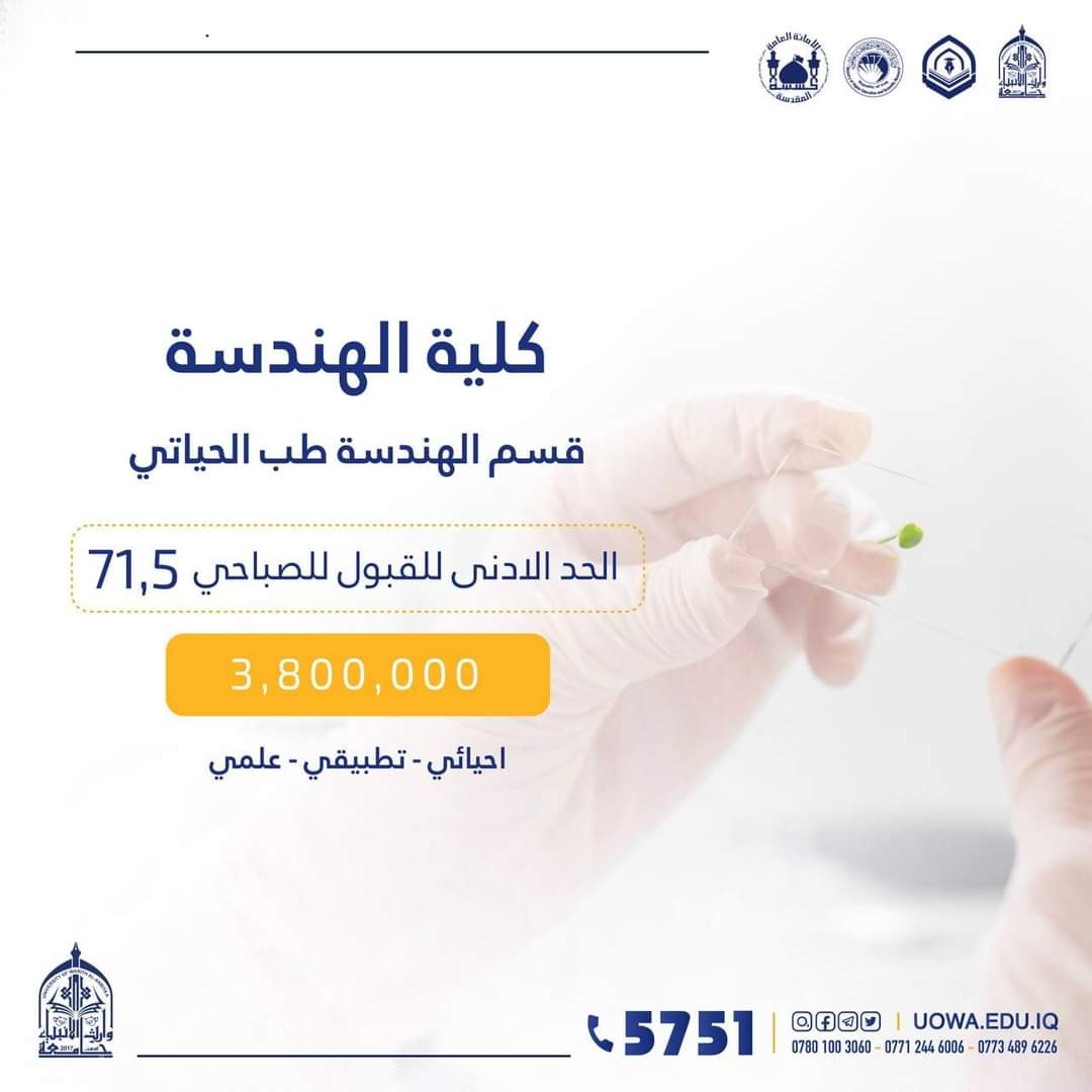 نبذه مختصرة عن ???? قسم هندسة الطب الحياتي ???????? يقبل طلبة خريجي الدراسة الاعدادية الفرع (العلمي — الأحيائي— التطبيقي )???? الدراسة : صباحي???? مدة الدراسة : 5 سنوات دراسية ????القسط الدراسي : (3.800.000) ????الحد الادنى لمعدل القبول (71.5 صباحي)???? يمنح الطالب درجة البكالوريوس في هندسة الطب الحياتي بعد اجتيازه بنجاح ويعين بعنوان وظيفي(مهندس)كون مدة الدراسة في القسم هي خمس ???? يكون الخريج بعد منحه الشهادة مؤهلاً للعمل في المجالات الهندسية الآتية:1- الجامعات وهيئات مراقبة التعليمات والجودة الخاصة بالقياسات الهندسية الطبية والعمل في المكاتب الاستشارية في مجال تخصصه.2- عمل وتصميم وتصنيع وتطوير وإدامة الأجهزة والمعدات الطبية3- تصميم وتصنيع الأعضاء البشرية التعويضية وخصائص المواد المستخدمة في صناعتها.4- اكتساب المهارات الأساسية التي تؤهله الى إعداد متطلبات تصميم المستشفيات الحديثة والمراكز الصحية والوحدات الصحية الأخرى.5- يكون ضمن فريق العمليات الجراحية للتهيئة والإشراف على الأجهزة والمعدات الطبية.6- الإشتراك مع الفريق الطبي في اختيار وملائمة الأعضاء التعويضية