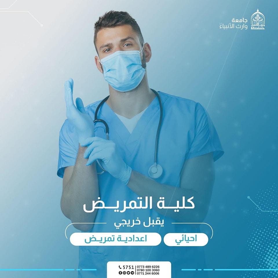 تعد كلية التمريض في جامعة وارث الانبياء عليه السلام من ضمن كليات المجموعة الطبية حيث تقبل هذه الكلية خريجوا الدراسة الإعدادية الفرع الاحيائي فضلا عن قبول خريجي إعدادية التمريض حيث تمتاز كلية التمريض بملاكاتها المتخصصة في رسم الخطط الاستراتيجية وتنفيذها ومن اهمها متابعة خريجوا الكلية حيث تضمنت الخطة للعام الماضي تعيين الخريجين في مؤسسة وارث الدولية للأورام ولهذا العام تعيين خريجي الكلية في المؤسسات الصحية التابعة إلى العتبة الحسينية المقدسة